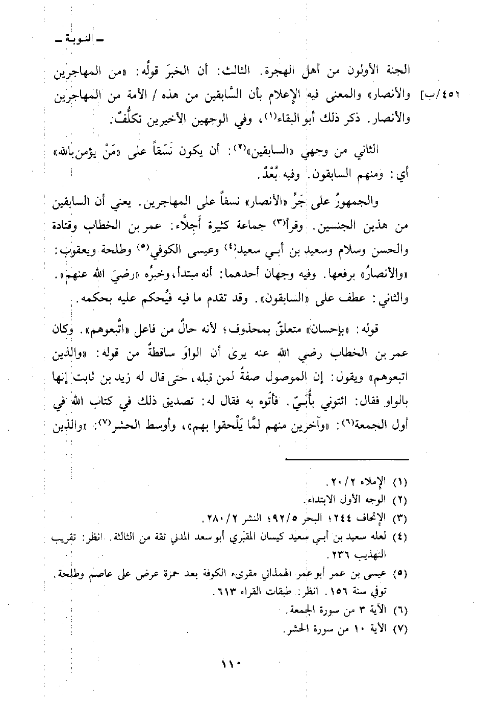 والجمهورُ على جَرِّ «الأنصار» نسقاً على المهاجرين. يعني أن السابقين من هذين الجنسين. وقرأ جماعة كثيرة أَجِلاَّء: عمر بن الخطاب وقتادة والحسن وسلام وسعيد بن أبي سعيد وعيسى الكوفي وطلحة ويعقوب: «والأنصارُ» برفعها. وفيه وجهان أحدهما: أنه مبتدأ، وخبرُه «رضيَ الله عنهم» . والثاني: عطف على «السابقون» . وقد تقدم ما فيه فيُحكم عليه بحكمه.
