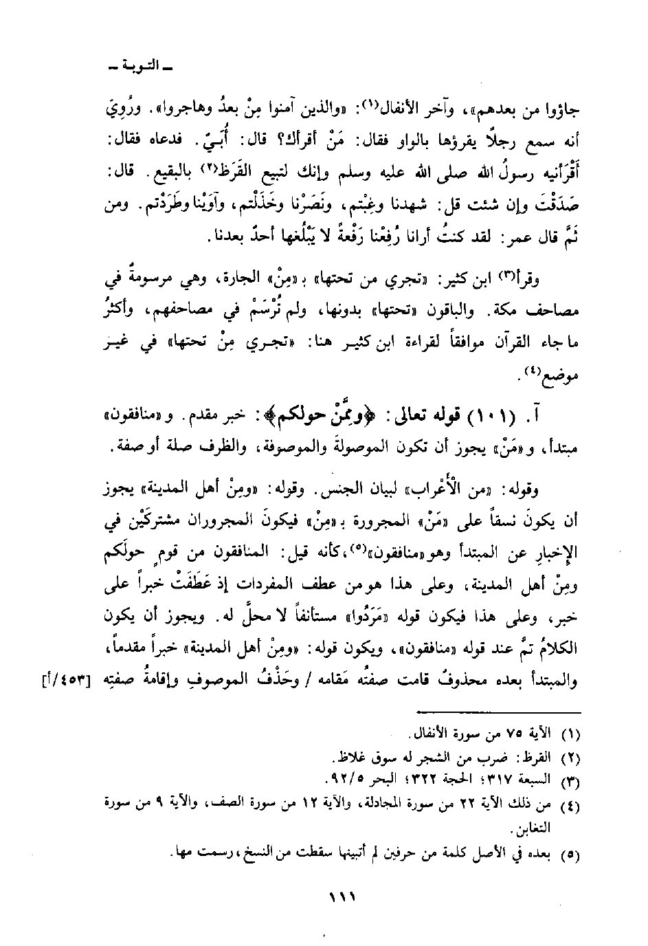 جَآءُوا مِن بَعْدِهِمْ} [الآية: 10] ، وآخر الأنفال: {والذين آمَنُواْ مِن بَعْدُ وَهَاجَرُواْ} [الآية: 75] . ورُوِي أنه سمع رجلاً يقرؤها بالواو فقال: مَنْ أقرأك؟ قال: أُبَيّ. فدعاه فقال: أَقْرَأنيه رسولُ الله صَلَّى اللهُ عَلَيْهِ وَسَلَّمَ وإنك لتبيع القَرَظ بالبقيع. قال: صَدَقْتَ وإن شئت قل: شهدنا وغِبْتم، ونَصَرْنا وخَذَلْتم، وآوَيْنا وطَرَدْتم. ومن ثَمَّ قال عمر: لقد كنتُ أرانا رُفِعْنا رَفْعةً لا يَبْلُغها أحدٌ بعدنا.