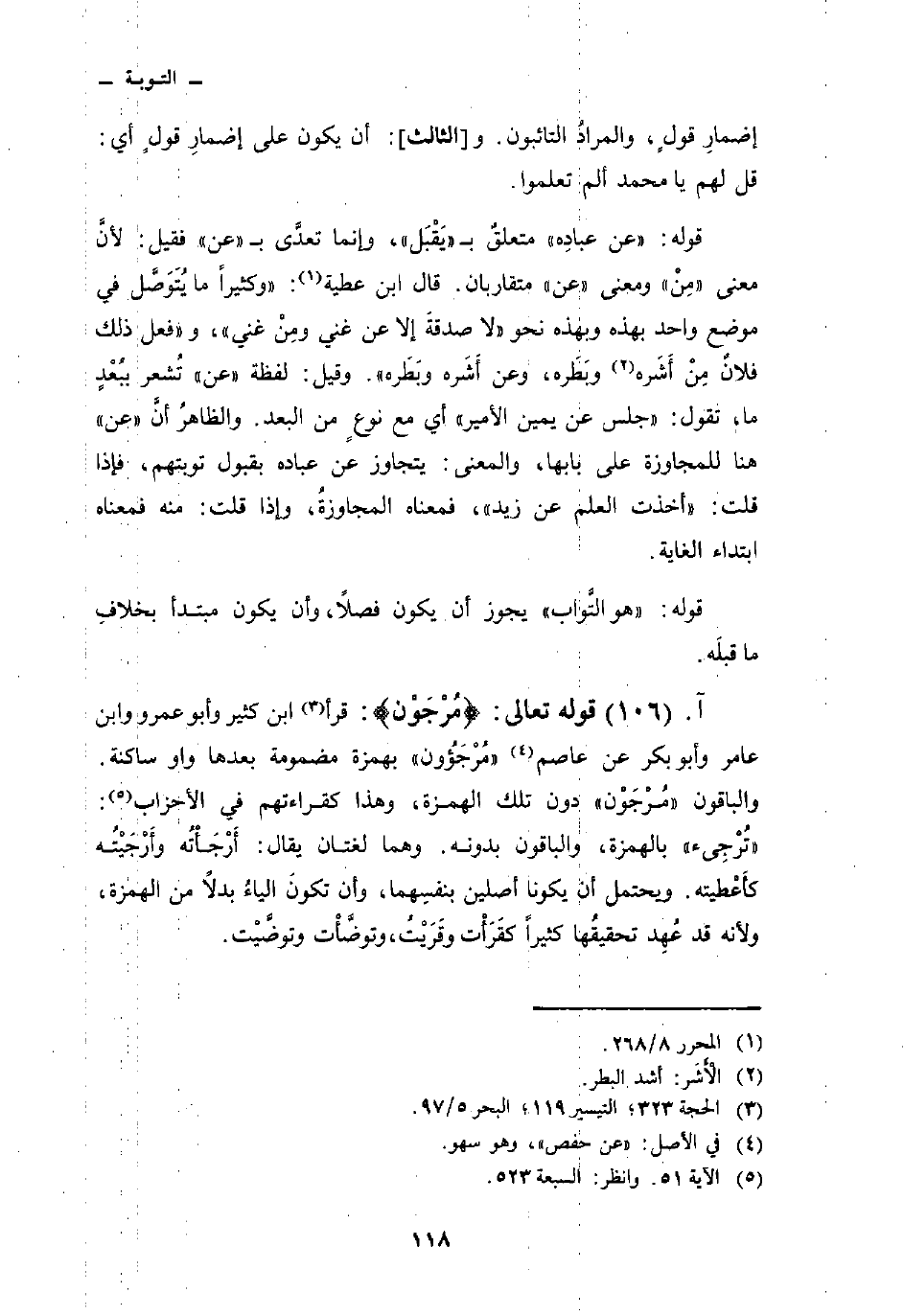 قوله: {عَنْ عِبَادِهِ} متعلقٌ ب «يَقْبَل» ، وإنما تعدَّى ب «عن» فقيل: لأنَّ معنى «مِنْ» ومعنى «عن» متقاربان. قال ابن عطية: «وكثيراً ما يُتَوَصَّل في موضع واحد بهذه وبهذه نحو» لا صدقةَ إلا عن غني ومِنْ غني «، و» فعل ذلك فلانٌ مِنْ أَشَره وبَطَره، وعن أَشَره وبَطَره «. وقيل: لفظه» عن «تُشعر ببُعْدٍ ما، تقول:» جلس عن يمين الأمير «أي مع نوعٍ من البعد. والظاهرُ أنَّ» عن «هنا للمجاوزة على بابها، والمعنى: يتجاوز عن عباده بقبول توبتهم، فإذا قلت:» أخذت العلم عن زيد «، فمعناه المجاوزةُ، وإذا قلت: منه فمعناه ابتداء الغاية.