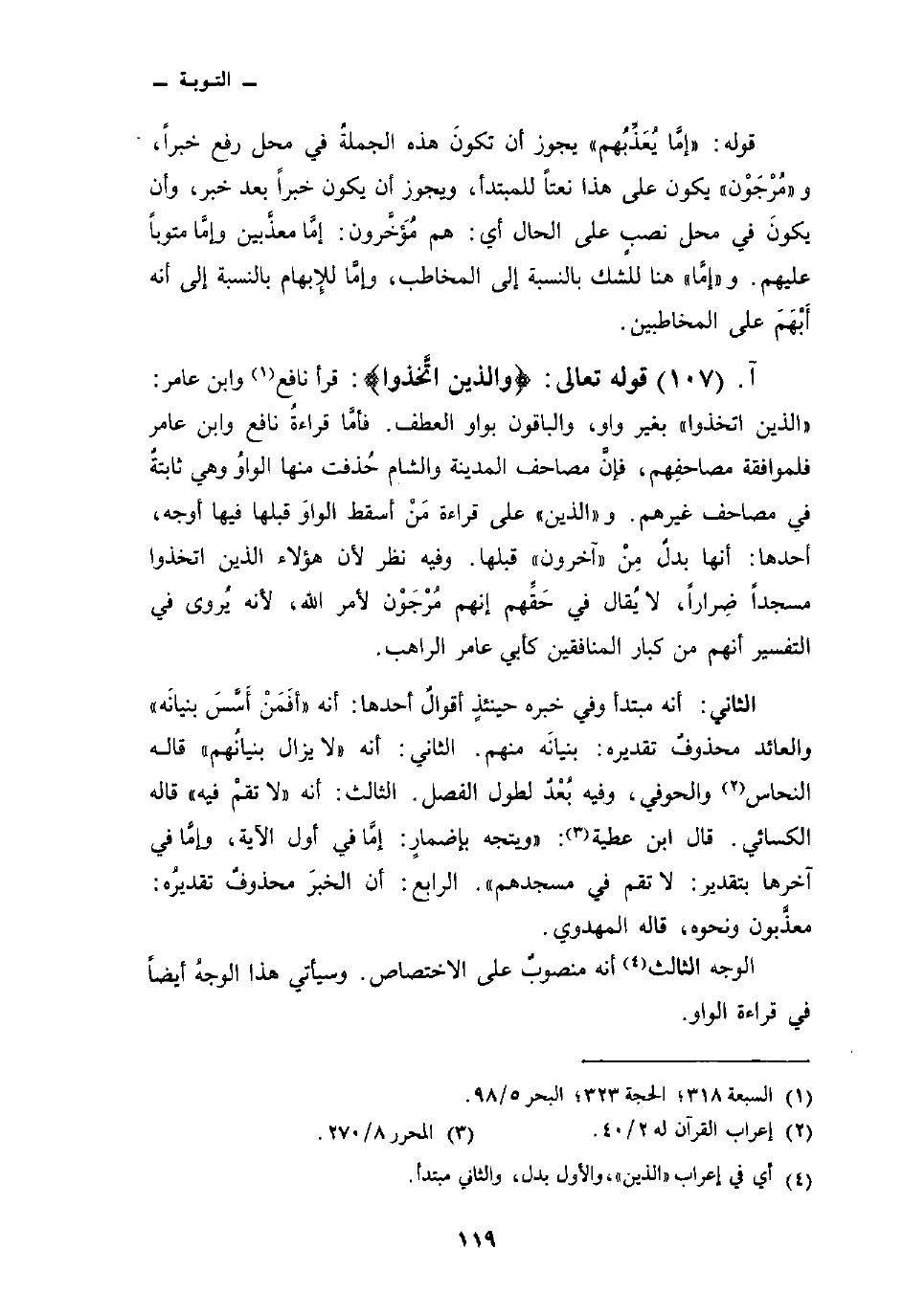 قوله تعالى: {والذين اتخذوا} : قرأ نافع وابن عامر: «الذين اتخذوا» بغير واو، والباقون بواو العطف. فأمَّا قراءةُ نافع وابن عامر فلموافقة مصاحفِهم، فإنَّ مصاحف المدينة والشام حُذفت منها الواوُ وهي ثابتةٌ في مصاحف غيرهم. و «الذين» على قراءة مَنْ أسقط الواوَ قبلها فيها أوجه، أحدها: أنها بدلٌ مِنْ «آخرون» قبلها. وفيه نظر لأن هؤلاء الذين اتخذوا مسجداً ضِراراً، لا يُقال في حَقِّهم إنهم مُرْجَوْن لأمر الله، لأنه يُروى في التفسير أنهم من كبار المنافقين كأبي عامر الراهب.