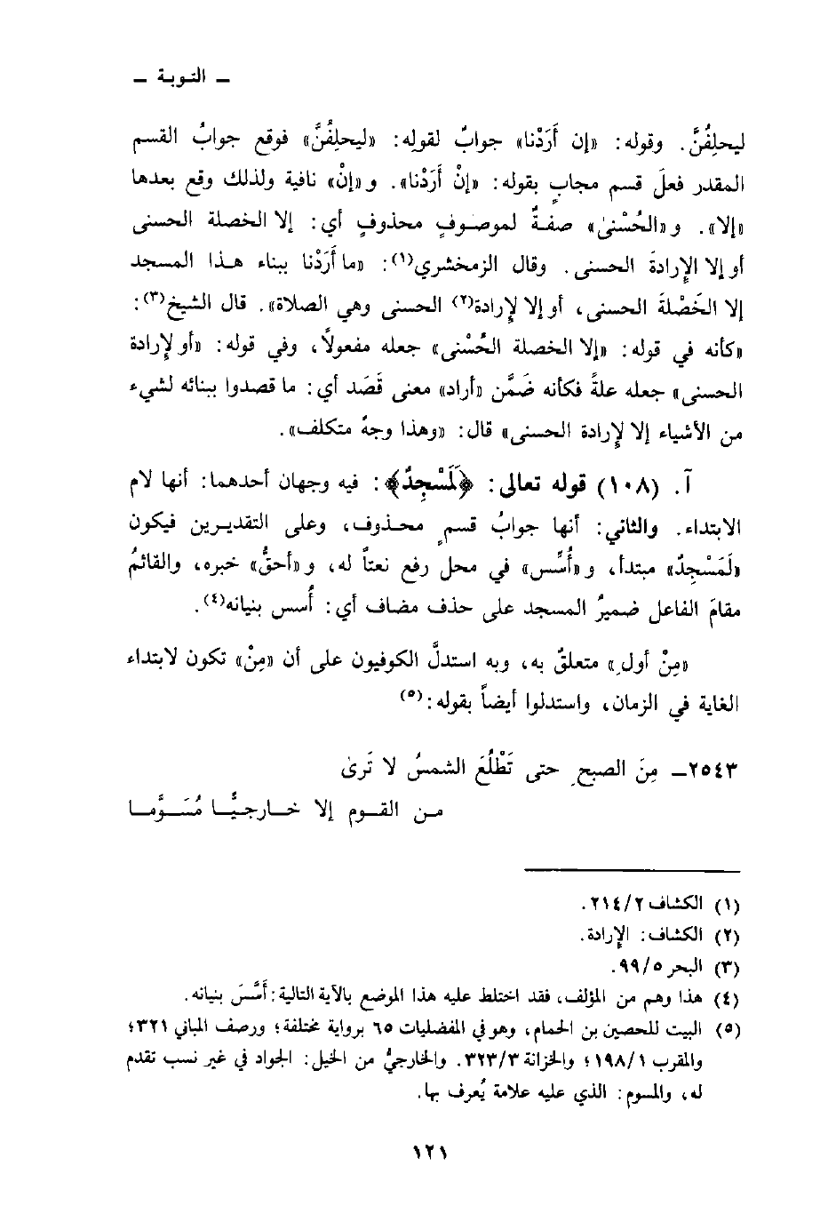 ليحلِفُنَّ. وقوله:» إن أَرَدْنا «جوابٌ لقولِه:» ليحلِفُنَّ «فوقع جوابُ القسم المقدر فعلَ قسم مجابٍ بقوله:» إنْ أَرَدْنا «.» إنْ «نافية ولذلك وقع بعدها» إلا «. و» الحسنى «صفةً لموصوفٍ محذوفٍ أي: إلا الخصلة الحسنى أو إلا الإِرادةَ الحسنى. وقال الزمخشري:» ما أَرَدْنا ببناء هذا المسجد إلا الخَصْلة الحسنى، أو إلا لإِردة الحسنى وهي الصلاة «. قال الشيخ:» كأنه في قوله: «إلا الخصلة الحُسْنى» جعله مفعولاً، وفي قوله: «أو لإِرادة الحسنى» جعله علةً فكأنه ضَمَّن «أراد» معنى قَصَد أي: ما قصدوا ببنائه لشيء من الأشياء إلا لإِرادة الحسنى «قال:» وهذا وجهٌ متكلف «.