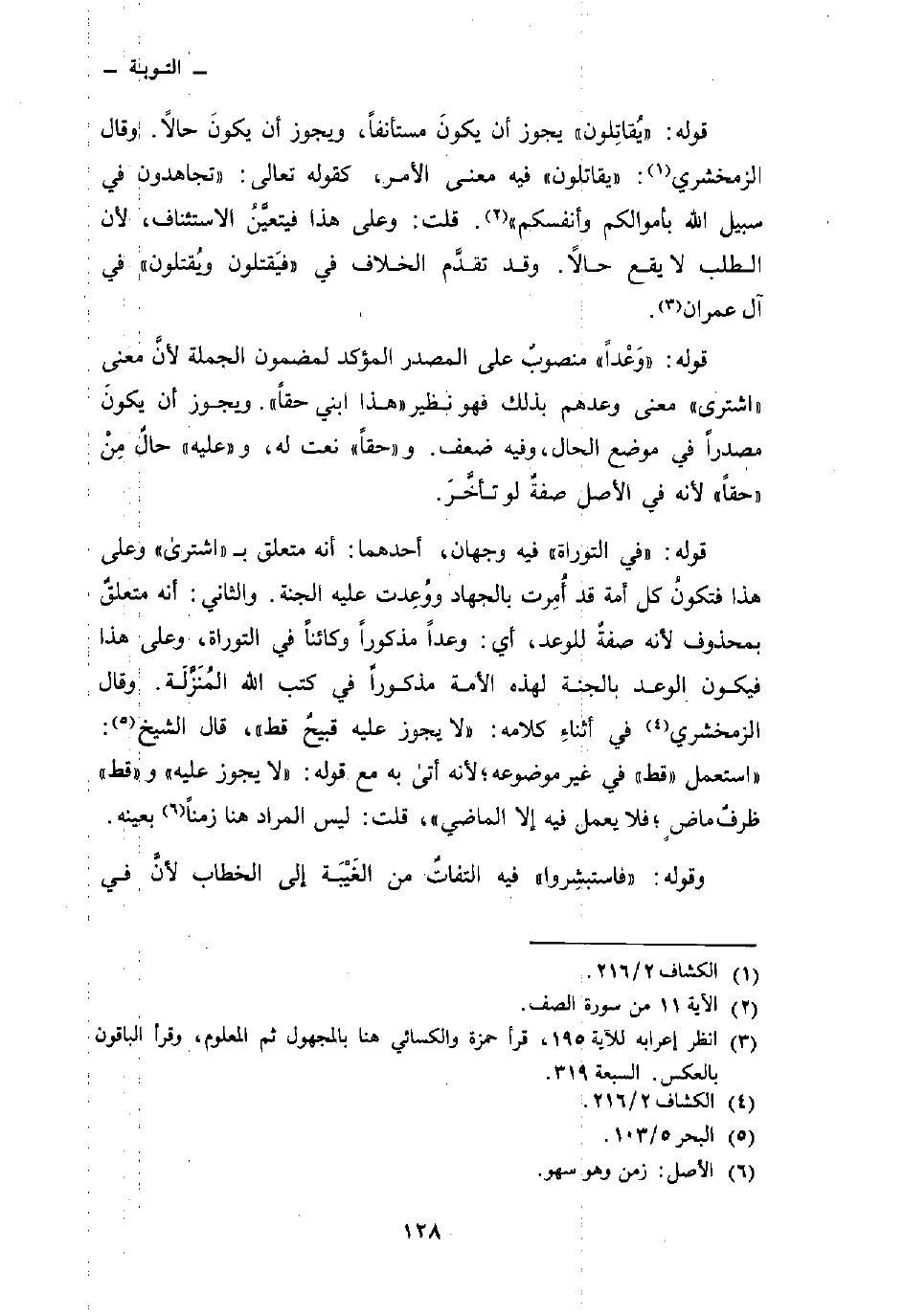 قوله: {فِي التوراة} فيه وجهان، أحدهما: أنه متعلق ب «اشترى» وعلى هذا فتكونُ كل أمة قد أُمِرت بالجهاد ووُعِدت عليه الجنة. والثاني: أنه متعلقٌ بمحذوف لأنه صفةٌ للوعد، أي: وعداً مذكوراً وكائناً في التوراة، وعلى هذا فيكون الوعد بالجنة لهذه الأمة مذكوراً في كتب الله المُنَزَّلَة. وقال الزمخشري في أثناءِ كلامه: «لا يجوز عليه قبيحٌ قط» ، قال الشيخ: «استعمل» قط «في غير موضوعه؛ لأنه أتى به مع قوله:» لا يجوز عليه «و» قط «ظرفٌ ماضٍ؛ فلا يعمل فيه إلا الماضي» ، قلت: ليس المراد هنا زمناً بعينه.