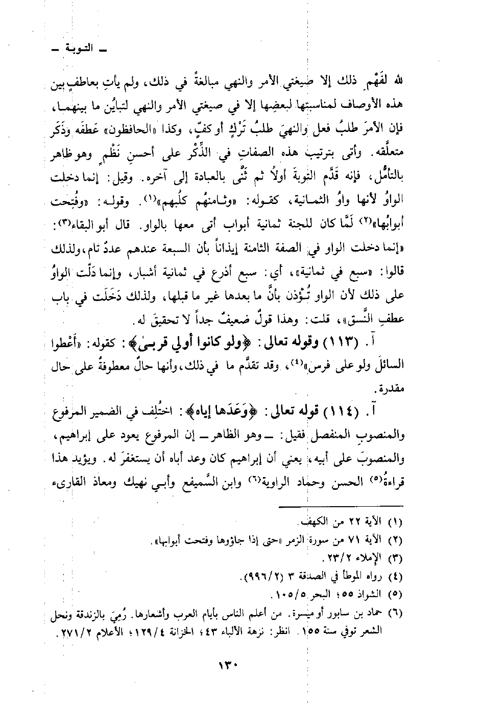 لله لفَهْمِ ذلك إلا صيغتي الأمر والنهي مبالغةً في ذلك، ولم يأتِ بعاطفٍ بين هذه الأوصاف لمناسبتها لبعضِها إلا في صيغتي الأمر والنهي لتبايُن ما بينهما، فإن الأمرَ طلبُ فعل والنهيَ طلبُ تَرْكٍ أو كفٍّ، وكذا» الحافظون «عَطفَه وذَكَر متعلَّقه. وأتى بترتيب هذه الصفاتِ في الذِّكْر على أحسنِ نَظْمٍ وهو ظاهر بالتأمُّل، فإنه قَدَّم التوبةَ أولاً ثم ثَنَّى بالعبادة إلى آخره. وقيل: إنما دخلت الواوُ لأنها واوُ الثمانية، كقوله: {وَثَامِنُهُمْ كَلْبُهُمْ} [الكهف: 22] . وقوله: {وَفُتِحَتْ أَبْوَابُهَا} [الزمر: 71] لَمَّا كان للجنة ثمانية أبواب أتى معها بالواو. وقال أبو البقاء:» إنما دخلت الواو في الصفة الثامنة إيذاناً بأن السبعة عندهم عددٌ تام، ولذلك قالوا: «سبع في ثمانية» ، أي: سبع أذرع في ثمانية أشبار، وإنما دَلّت الواوُ على ذلك لأن الواو تُؤْذن بأنَّ ما بعدها غير ما قبلها، ولذلك دَخَلَت في باب عطفِ النَّسق «، قلت: وهذا قولٌ ضعيفٌ جداً لا تحقيقَ له.