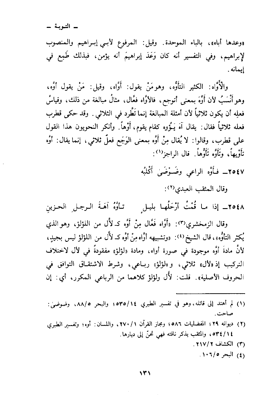 وقال الزمخشري: «أَوَّاه فَعَّال مِنْ أَوَّه ك لأَل من اللؤلؤ، وهو الذي يُكثر التأوُّه» ، قال الشيخ: «وتشبيهه أوَّاه مِنْ أوَّه ك لأَّل من اللؤلؤ ليس بجيدٍ، لأنَّ مادةَ أوَّه موجودة في صورة أواه، ومادة» لؤلؤ «مفقودةٌ في لأل لاختلاف التركيب إذ» لأل «ثلاثي، و» لؤلؤ «راعي، وشرط الاشتقاق التوافق في الحروف الأصلية» . قلت: لاَّل ولؤلؤ كلاهما من الرباعي المكرر، أي: إن