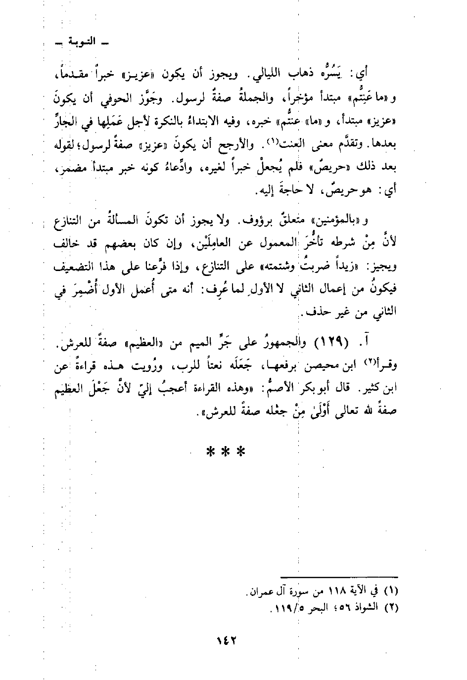 أي: يَسُرُّه ذهاب الليالي. ويجوز أن يكون «عزيز» خبراً مقدماً، و «ما عَنِتُّم» مبتدأ مؤخراً، والجملةُ صفةٌ لرسول. وجَوَّز الحوفي أن يكونَ «عزيز» مبتدأ، و «ما» عنتُّم خبره، وفيه الابتداءُ بالنكرة لأجل عَمَلِها في الجارِّ بعدها. وتقدَّم معنى العنت. والأرجح أن يكونَ «عزيز» صفةً لرسول؛ لقوله بعد ذلك «حريصٌ» فلم يُجعلْ خبراً لغيره، وادِّعاءُ كونه خبر مبتدأ مضمر، أي: هو حريصٌ، لا حاجةَ إليه.