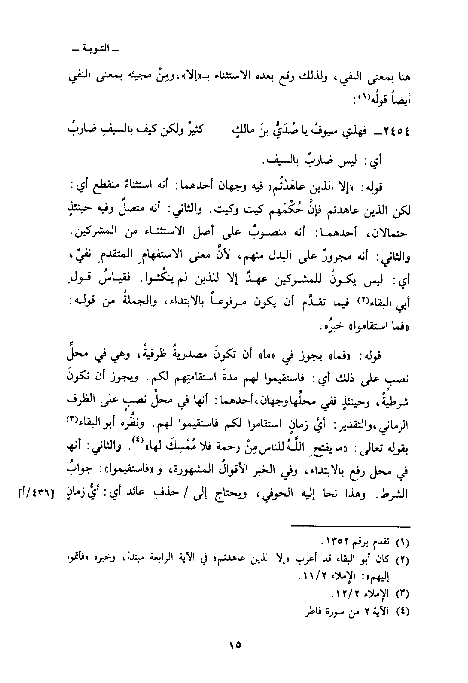 قوله: {إِلاَّ الذين عَاهَدْتُمْ} فيه وجهان أحداهما: أنه استثناءٌ منقطع أي: لكن الذين عاهدتم فإنَّ حُكْمَهم كيت وكيت. والثاني: أنه متصلٌ وفيه حينئذٍ احتمالان، أحدهما: أنه منصوبٌ على أصل الاستثناء من المشركين. والثاني: أنه مجرورٌ على البدل منهم، لأنَّ معنى الاستفهامِ المتقدمِ نفيٌ، أي: ليس يكونُ للمشركين عهدٌ إلا للذين لم ينكُثوا. فقياسُ قولِ أبي البقاء فيما تقدَّم أن يكون مرفوعاً بالابتداء، والجملةُ من قوله «فما استقاموا» خبرُه.