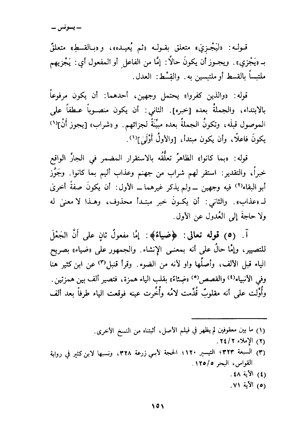 قوله تعالى: {ضِيَآءً} : إمَّا مفعولٌ ثانٍ على أَنَّ الجَعْلَ للتصيير، وإمَّا حالٌ على أنه بمعنى الإِنشاء. والجمهور على «ضياء» بصريح الياء قبل الألف، وأصلُها واو لأنه من الضوء. وقرأ قنبل عن ابن كثير هنا وفي الأنبياء والقصص «ضِئاءً» بقلب الياء همزة، فتصير ألف بين همزتين. وأُوِّلت على أنه مقلوبٌ قُدِّمت لامُه وأُخِّرت عينه فوقعت الياء طرفاً بعد ألف