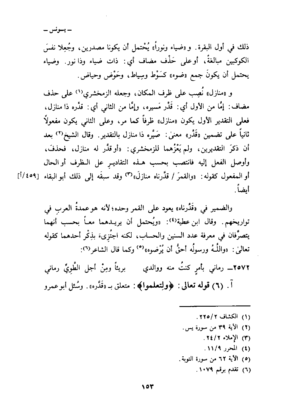 والضمير في» قَدَّرناه «يعود على القمر وحده؛ لأنه هو عمدةُ العربِ في تواريخهم. وقال ابن عطية:» ويُحتمل أن يريدهما معاً بحسب أنهما يتصرَّفان في معرفة عدد السنين والحساب، لكنه اجتُزِىءَ بذِكْر أحدهما كقوله تعالى: {والله وَرَسُولُهُ أَحَقُّ أَن يُرْضُوهُ} [التوبة: 62] وكما قال الشاعر: