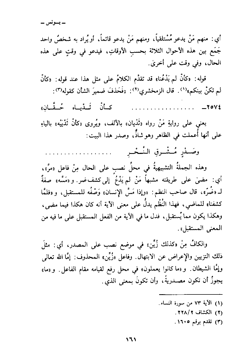 وهذه الجملةُ التشبيهيةُ في محلِّ نصبٍ على الحال مِنْ فاعل «مرَّ» ، أي: مضى على طريقته مشبهاً مَنْ لم يَدْعُ إلى كشف ضر. و «مَسَّه» صفةٌ ل «ضُرّ» ، قال صاحب النظم: {وَإِذَا مَسَّ الإنسان} وَصْفُه للمستقبل، و «فلمَّا كشفنا» للماضي، فهذا النَّظْم يدلُّ على معنى الآية أنه كان هكذا فيما مضى، وهكذا يكون مما يُستقبل، فدل ما في الآية من الفعل المستقبل على ما فيه من المعنى المستقبل «.
