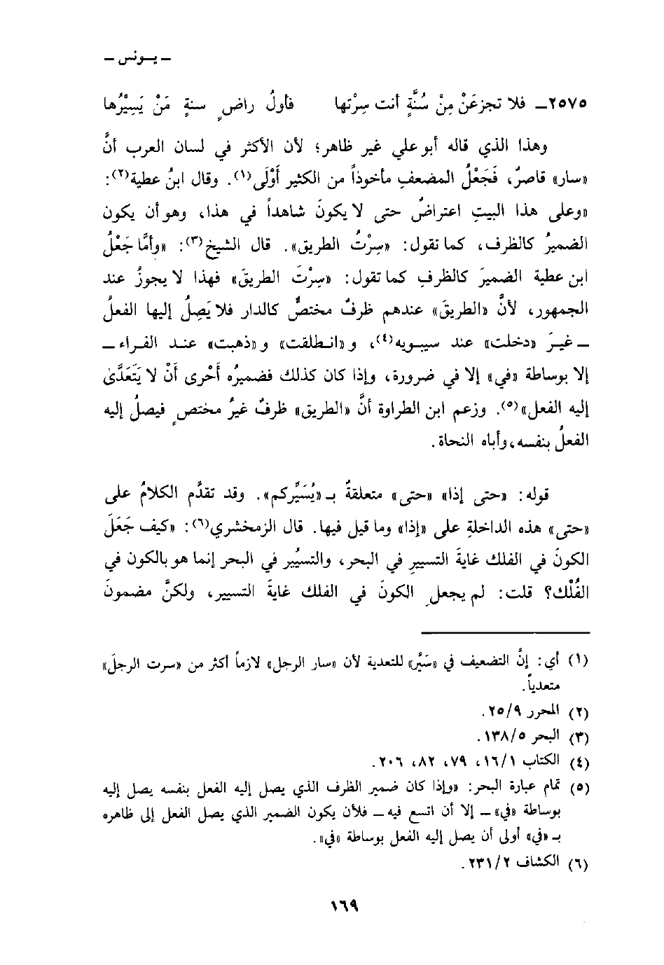 وهذا الذي قاله أبو علي غير ظاهر؛ لأن الأكثر في لسان العرب أنَّ» سار «قاصرٌ، فَجَعْلُ المضعفِ مأخوذاً من الكثير أَوْلَى. وقال ابنُ عطية:» وعلى هذا البيتِ اعتراضٌ حتى لا يكونَ شاهداً في هذا، وهو أن يكون الضميرُ كالظرفُ، كما تقول: «سِرْتُ الطريق» . قال الشيخ: «وأمَّا جَعْلُ ابن عطية الضميرَ كالظرفِ كما تقول:» سِرْتَ الطريقَ «فهذا لا يجوزُ عند الجمهور، لأنَّ» الطريقَ «عندهم ظرفٌ مختصٌّ كالدار فلا يَصِلُ إليها الفعلُ غيرَ» دخلت «عند سيبويه، و» انطلقت «و» ذهبت «عند الفراء إلا بوساطة» في «إلا في ضرورة، وإذا كان كذلك فضميرُه أَحْرى أَنْ لا يتعدى إليه الفعل» . وزعم ابن الطراوة أنَّ «الطريق» ظرفٌ غيرُ مختصٍ فيصلُ إليه الفعلُ بنفسه، وأباه النحاة.