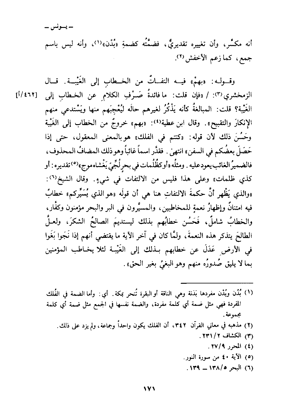 وقوله: {بِهِم} فيه التفاتٌ من الخطابِ إلى الغَيْبة. قال الزمخشري: / «فإن قلت: ما فائدةُ صَرْفِ الكلامِ عن الخطابِ إلى الغَيْبة؟ قلت: المبالغةُ كأنه يَذْكُرُ لغيرهم حالَه ليُعْجِبَهم منها ويَسْتدعي منهم الإِنكارَ والتقبيح» . وقال ابن عطية: «بهم» خروجٌ من الخطاب إلى الغَيْبة وحَسُنَ ذلك لأن قوله: {كُنتُمْ فِي الفلك} هو بالمعنى المعقول، حتى إذا حَصَلَ بعضُكم في السفن «انتهى. فقدَّر اسماً غائباً وهو ذلك المضافُ المحذوف، فالضميرُ الغائب يعود عليه. ومثلُه {أَوْ كَظُلُمَاتٍ فِي بَحْرٍ لُّجِّيٍّ يَغْشَاهُ مَوْجٌ} [النور: 40] تقديره: أو كذي ظلمات» وعلى هذا فليس من الالتفات في شيءٍ. وقال الشيخ: «والذي يَظْهر أنَّ حكمةَ الالتفاتِ هنا هي أن قولَه {هُوَ الذي يُسَيِّرُكُمْ} خطابٌ فيه امتنانٌ وإظهارُ نعمةٍ للمخاطبين، والمسيَّرون في البر والبحر مؤمنون وكفَّار، والخطابُ شاملٌ، فَحَسُن خطابُهم بذلك ليستديمَ الصالحُ الشكرَ، ولعلَّ الطالحَ يتذكر هذه النعمةَ، ولمَّا كان في آخر الآية ما يقتضي أنهم إذا نَجَوا بَغَوا في الأرضِ عَدَلَ عن خطابهم بذلك إلى الغَيْبة لئلا يخاطب المؤمنين بما لا يليق صُدورُه منهم وهو البغيُ بغير الحق»
