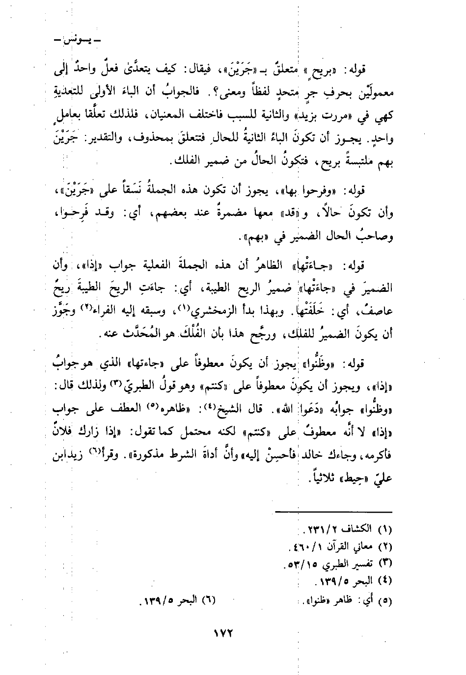 قوله: {بِرِيحٍ} متعلقٌ ب «جَرَيْنَ» ، فيقال: كيف يتعدى فعلٌ واحدٌ إلى معمولَيْن بحرفِ جرٍ متحدٍ لفظاً ومعنى؟ . فالجوابُ أن الباءَ الأولى للتعدية كهي في «مررت بزيد» والثانية للسبب فاختلف المعنيان، فلذلك تعلَّقا بعاملِ واحدٍ. يجوز أن تكونَ الباءُ الثانيةُ للحالِ فتتعلقَ بمحذوف، والتقدير: جَرَيْنَ بهم ملتبسةً بريح، فتكونُ الحالُ من ضمير الفلك.