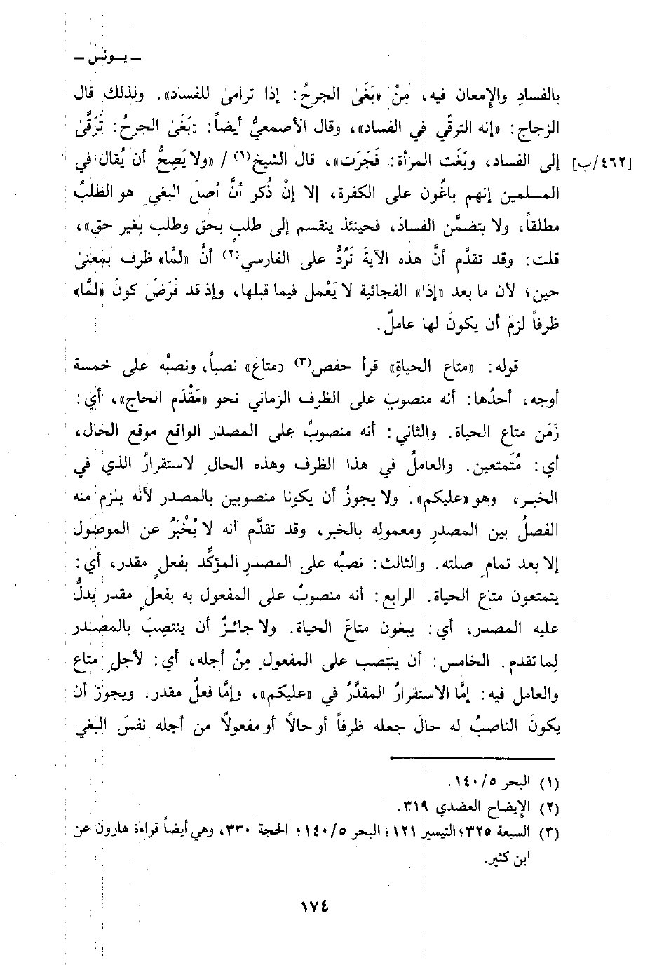 قوله: {مَّتَاعَ الحياة} قرأ حفص «متاعَ» نصباً، ونصبُه على خمسة أوجه، أحدُها: أنه منصوب على الظرف الزماني نحو «مَقْدَم الحاج» ، أي: زَمَن متاع الحياة. والثاني: أنه منصوبٌ على المصدر الواقع موقع الحال، أي: مُتَمتعين. والعاملُ في هذا الظرف وهذه الحالِ الاستقرار الذي في الخبر، وهو «عليكم» . ولا يجوزُ أن يكونا منصوبين بالمصدر لأنه يلزم منه الفصلُ بين المصدرِ ومعمولِه بالخبر، وقد تقدَّم أنه لا يُخْبَرُ عن الموصول إلا بعد تمامِ صلته. والثالث: نصبُه على المصدرِ المؤكِّد بفعلٍ مقدر، أي: يتمتعون متاع الحياة. الرابع: أنه منصوبٌ على المفعول به بفعلٍ مقدر يدلُّ عليه المصدر، أي: يبغون متاعَ الحياة. ولا جائزٌ أن ينتصِبَ بالمصدر لِما تقدم. الخامس: أن ينتصب على المفعولِ مِنْ أجله، أي: لأجلِ متاع والعامل فيه: إمَّا الاستقرارُ المقدَّرُ في «عليكم» ، وإمَّا فعلٌ مقدر. ويجوز أن يكونَ الناصبُ له حالَ جعله ظرفاً أو حالاً او مفعولاً من أجله نفسَ البغي