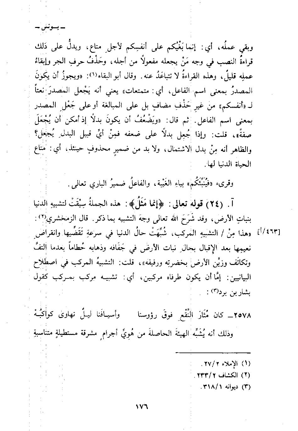 وبقي عملُه، أي: إنما بَغْيُكم على أنفسِكم لأجِل متاع، ويدلُّ على ذلك قراءةُ النصب في وجه مَنْ يجعله مفعولاً من أجله، وحَذْفُ حرفِ الجر وإبقاءُ عملِه قليلٌ، وهذه القراءةُ لا تتباعَدُ عنه. وقال أبو البقاء: «ويجوزُ أن يكونَ المصدرُ بمعنى اسم الفاعل، أي: متمتعات» يعني أنه يَجْعل المصدرَ نعتاً ل «أنفسكم» من غيرِ حَذْفِ مضافٍ بل على المبالغة أو على جَعْلِ المصدر بمعنى اسم الفاعل. ثم قال: «ويَضْعُفُ أن يكونَ بدلاً إذ أمكن أن يُجْعَلَ صفةً» ، قلت: وإذا جُعِل بدلاً على ضعفه فمِنْ أيِّ قبيل البدلِ يُجعل؟ والظاهر أنه مِنْ بدل الاشتمال، ولا بد من ضميرٍ محذوفٍ حنيئذ، أي: متاع الحياة الدنيا لها.