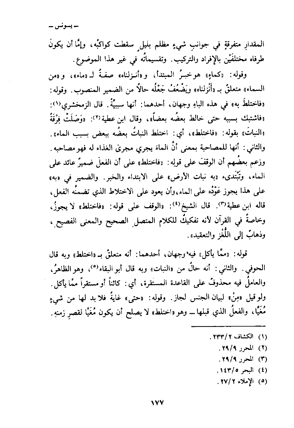 وقوله: {كَمَآءٍ} هو خبرُ المبتدأ، و «أنزلناه» صفةٌ ل «ماء» ، و «من السماء» متعلقٌ ب «أَنْزلناه» ويَضْعُفُ جَعْلُه حالاً من الضمير المنصوب. وقوله: «فاختلطَ به» في هذه الباءِ وجهان، أحدهما: أنها سببيَّةٌ. قال الزمخشري: «فاشتبك بسببه حتى خالط بعضُه بعضاً» ، وقال ابن عطية: «وَصَلَتْ فِرْقَةٌ» النباتَ «بقوله:» فاختلط «، أي: اختلط النباتُ بعضُه ببعض بسبب الماء» . والثاني: أنها للمصاحبة بمعنى أنَّ الماءَ يجري مجرى الغذاء له فهو مصاحبه. وزعم بعضُهم أن الوقفَ على قولِه: «فاختلط» على أن الفعلَ ضميرٌ عائد على الماء، وتَبْتَدىء {بِهِ نَبَاتُ الأرض} على الابتداء والخبر. والضمير في «به» على هذا يجوز عَوْدُه على الماء، وأن يعود على الاختلاط الذي تضمنَّه الفعل، قاله ابن عطية. قال الشيخ: «الوقف على قوله:» فاختلط «لا يجوزُ، وخاصةً في القرآن لأنه تفكيكٌ للكلام المتصلِ الصحيح والمعنى الفصيحِ، وذهابٌ إلى اللُّغْز والتعقيد» .