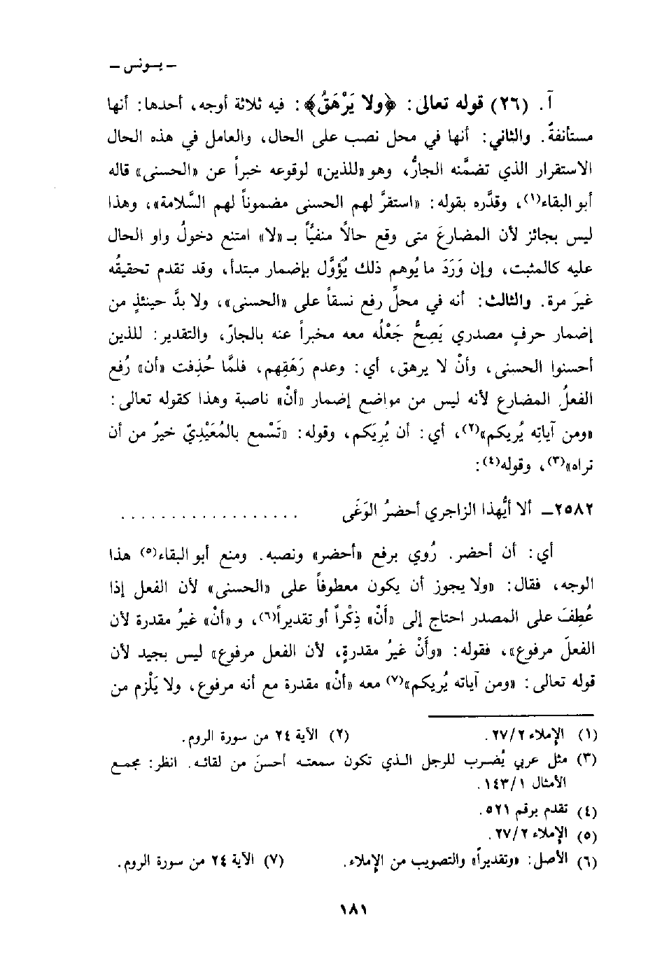 قوله تعالى: {وَلاَ يَرْهَقُ} : فيه ثلاثة أوجه، أحدها: أنها مستأنفةٌ. والثاني: أنها في محل نصب على الحال، والعامل في هذه الحال الاستقرار الذي تضمَّنه الجارُّ، وهو «للذين» لوقوعه خبراً عن «الحسنى» قاله أبو البقاء، وقدَّره بقوله: «استقرَّ لهم الحسنى مضموماً لهم السَّلامة» ، وهذا ليس بجائز لأن المضارعَ متى وقع حالاً منفيَّاً ب «لا» امتنع دخولُ واو الحال عليه كالمثبت، وإن وَرَدَ ما يُوهم ذلك يُؤَوَّل بإضمار مبتدأ، وقد تقدم تحقيقُه غيرَ مرة. والثالث: أنه في محلِّ رفع نسقاً على «الحسنى» ، ولا بدَّ حينئذٍ من إضمار حرفٍ مصدري يَصِحُّ جَعْلُه معه مخبراً عنه بالجارّ، والتقدير: للذين أحسنوا الحسنى، وأنْ لا يرهق، أي: وعدم رَهَقِهم، فلمَّا حُذِفت «أن» رُفع الفعلُ المضارع لأنه ليس من مواضع إضمار «أنْ» ناصبة وهذا كقوله تعالى: {وَمِنْ آيَاتِهِ يُرِيكُمُ} [الروم: 24] ، أي: أن يُرِيَكم، وقوله: «تَسْمع بالمُعَيْدِيّ خيرٌ من أن تراه» ، وقوله: