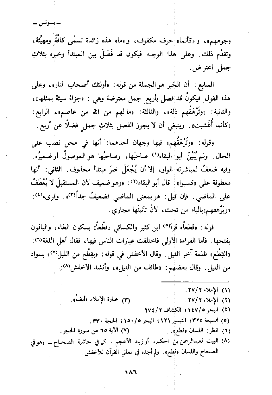 قوله: {قِطَعاً} قرأ ابن كثير والكسائي «قِطْعاً» بسكون الطاء، والباقون بفتحها. فأما القراءة الأولى فاختلفت عبارات الناس فيها، فقال أهل اللغة: «القِطْع» ظلمة آخر الليل. وقال الأخفش في قوله: «بقِطْع من الليل» بسواد من الليل. وقال بعضهم: «طائف من الليل» ، وأنشد الأخفش: