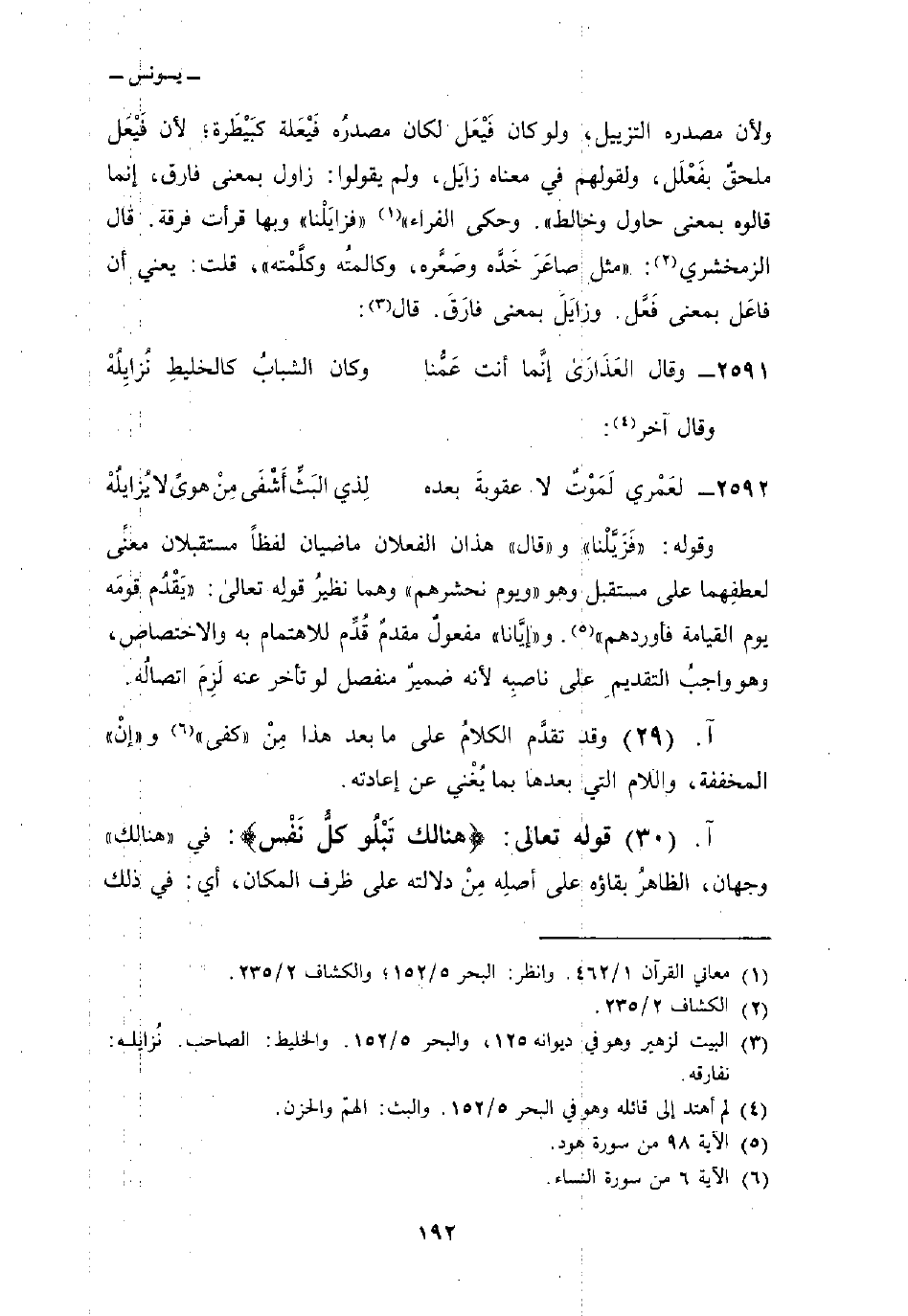 ولأن مصدره التزييل، ولو كان فَيْعَل لكان مصدرُه فَيْعَلة كبَيْطَرة؛ لأن فَيْعَل ملحقٌ بفَعْلَل، ولقولهم في معناه زايَل، ولم يقولوا: زاول بمعنى فارق، إنما قالوه بمعنى حاول وخالط «. وحكى الفراء» «فزايَلْنا» وبها قرأت فرقة. قال الزمخشري: «مثل صاعَرَ خَدَّه وصَعَّره، وكالمتُه وكلَّمْته» ، قلت: يعني أن فاعَل بمعنى فَعَّل. وزايَلَ بمعنى فارَقَ. قال: