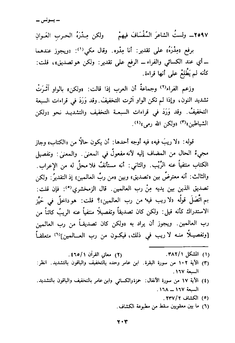 وزعم الفراء وجماعةٌ أن العرب إذا قالت: «ولكن» بالواو آثَرَتْ تشديد النون، وإذا لم تكن الواو آثرت التخفيفَ. وقد وَرَدَ في قراءات السبعة التخفيفُ. وقد وَرَدَ في قراءات السبعة التخفيف والتشديد نحو {ولكن الشياطين} [البقرة: 102] {ولكن الله رمى} [الأنفال: 17] .