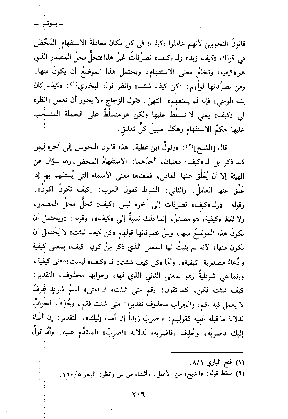قال [الشيخ] :» وقولُ ابن عطية: هذا قانون النحويين إلى آخره ليس كما ذكر بل ل «كيف» معنيان، أحدُهما: الاستفهامُ المحض، وهو سؤال عن الهيئة إلا أن يُعَلَّق عنها العامل، فمعناها معنى الأسماء التي يُستفهم بها إذا عُلِّق عنها العاملُ. والثاني: الشرط كقول العرب: «كيف تكونُ أكونُ» . وقوله: «ول» كيف «تصرفات إلى آخره ليس» كيف «تحلُّ محلَّ المصدر، ولا لفظ» كيفية «هو مصدرٌ، إنما ذلك نسبةٌ إلى» كيف «، وقوله:» ويحتمل أن يكونَ هذا الموضعُ منها، ومِنْ تصرفاتها قولهم: «كن كيف شئت» لا يَحْتمل أن يكون منها؛ لأنه لم يثبتْ لها المعنى الذي ذكر مِنْ كونِ «كيف» بمعنى كيفية وادِّعاءُ مصدرية «كيفية» .