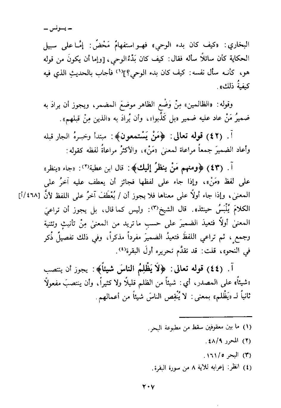 {وَمِنهُمْ مَّن يَنظُرُ إِلَيْكَ} : قال ابن عطية: «جاء» ينظر «على لفظ» مَنْ «، وإذا جاء على لفظها فجائز أن يعطف عليه آخرُ على المعنى، وإذا جاء أولاً على معناها فلا يجوز أن/ يُعْطَفَ آخرُ على اللفظ لأنَّ الكلامَ يُلْبَسُ حينئذ» . قال الشيخ: وليس كما قال، بل يجوز أن تراعيَ المعنى أولاً فتعيدَ الضميرَ على حسبِ ما تريد من المعنى مِنْ تأنيثٍ وتثنية وجمعٍ، ثم تراعي اللفظَ فتعيدُ الضميرَ مفرداً مذكراً، وفي ذلك تفصيلٌ ذُكر في النحو «، قلت: قد تقدَّم تحريره أولَ البقرة.
