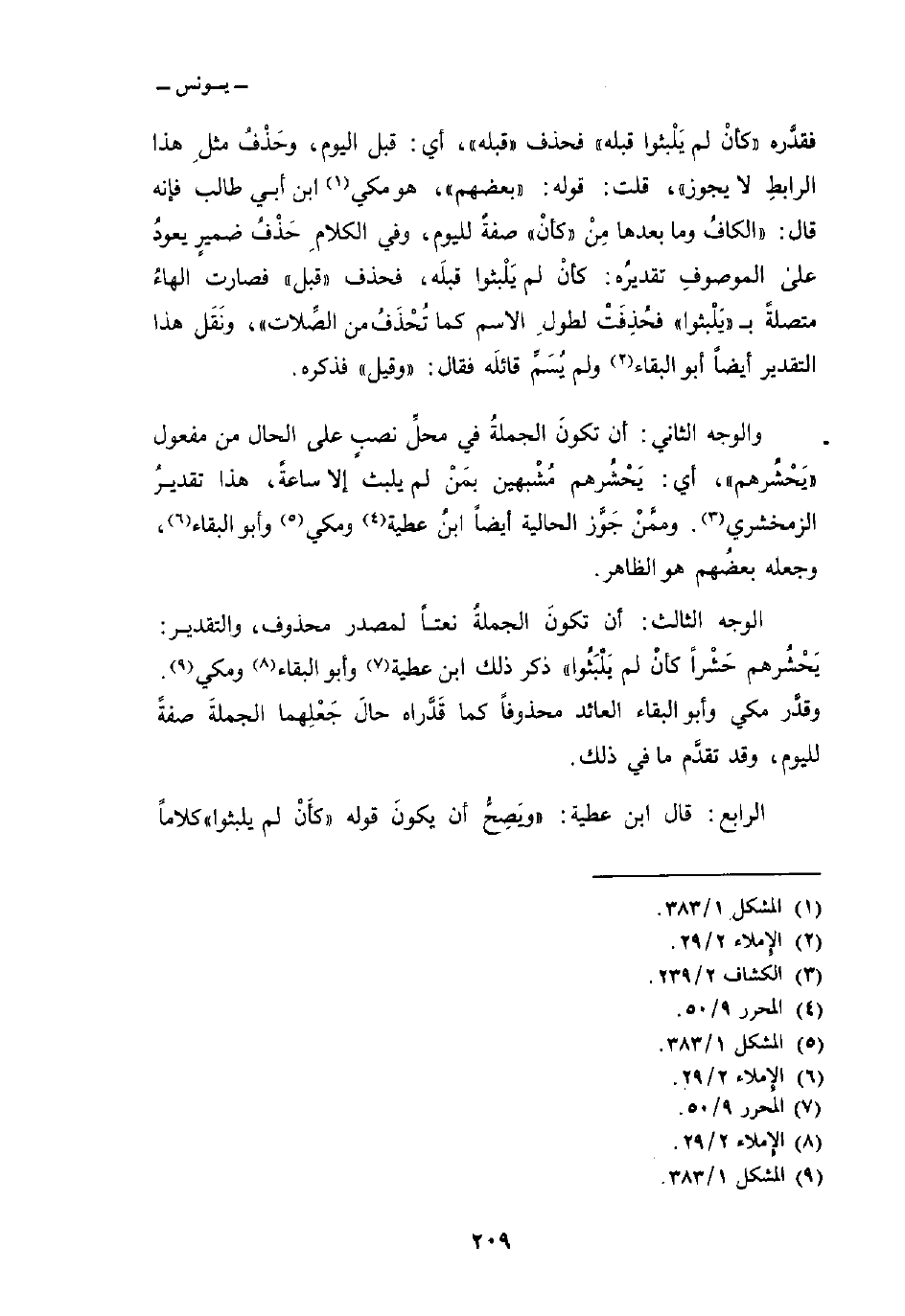 فقدَّره» كأن لم يَلْبثوا قبله «فحذف» قبله «، أي: قبل اليوم، وحَذْفُ مثلِ هذا الرباطِ لا يجوز» ، قلت: قوله: «بعضهم» ، هو مكي ابن أبي طالب فإنه قال: «الكافُ وما بعدها مِنْ» كأنْ «صفةٌ لليوم، وفي الكلامِ حَذْفُ ضميرٍ يعودُ على الموصوفِ تقديرُه: كأنْ لم يَلْبثوا قبلَه، فحذف» قبل «فصارت الهاءُ متصلةً ب» يَلْبثوا «فحُذِفَتْ لطولِ الاسم كما تُحْذَفُ من الصِّلات» ونَقَل هذا التقدير أيضاً أبو البقاء ولم يُسَمِّ قائلَه فقال: «وقيل» فذكره.