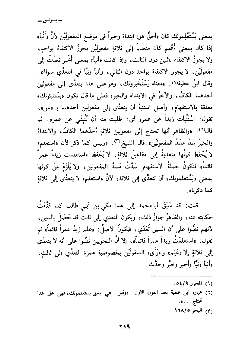 قلت: قد سَبَقَ أبا محمد إلى هذا مكي بن أبي طالب كما قدَّمْتُ حكايته عنه، والظاهرُ جوازُ ذلك، ويكون التعدي إلى ثالث قد حَصَلَ بالسين، لأنهم نَصُّوا على أن السين تُعَدّي، فيكونُ الأصلُ: «علم زيدٌ عمراً قائماً» ثم تقول: «استعلمْتُ زيداً عمراً قائماً» ، إلا أنَّ النحويين نَصُّوا على أنه لا يتعدَّى إلى ثلاثةٍ إلا «عَلِم» و «رأى» المنقولَيْن بخصوصيةِ همزةِ التعدِّي إلى ثالثٍ، وأنبأ ونَبَّأ وأخبر وخبَّر وحدَّث.