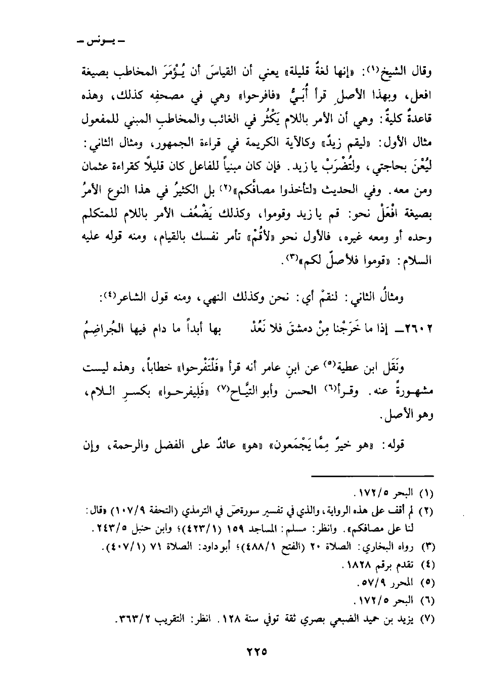 وقال الشيخ: «إنها لغةٌ قليلة» يعني أن القياسَ أن يُؤْمَرَ المخاطب بصيغة افعل، وبهذا الأصلِ قرأ أُبَيُّ «فافرحوا» وهي في مصحفِه كذلك، وهذه قاعدةٌ كليةٌ: وهي أن الأمر باللام يَكْثُر في الغائب والمخاطبِ المبني للمفعول مثال الأول: «ليقم زيداً» وكالآية الكريمة في قراءة الجمهور، ومثال الثاني: ليُعْنَ بحاجتي، ولتُضْرَبْ يا زيد. فإن كان مبنياً للفاعل كان قليلاً كقراءة عثمان ومن معه. وفي الحديث «لتأخذوا مصافَّكم» بل الكثيرُ في هذا النوع الأمرُ بصيغة افْعَلْ نحو: قم يا زيد وقوموا، وكذلك يَضْعُف الأمر باللام للمتكلم وحده أو ومعه غيره، فالأول نحو «لأقُمْ» تأمر نفسك بالقيام، ومنه قوله عليه السلام: «قوموا فلأصلّ لكم» .