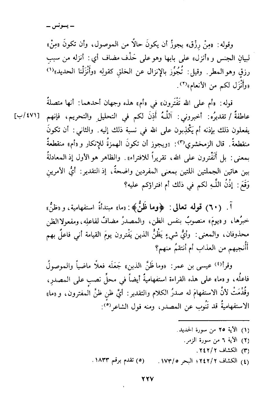وقرأ عيسى بن عمر: «وما ظَنَّ الذين» جَعَلَه فعلاً ماضياً والموصولُ فاعلُه، و «ما» على هذه القراءة استفهاميةٌ أيضاً في محلِّ نصبٍ على المصدرِ، وقُدّمَتْ لأنَّ الاستفهامَ له صدرُ الكلام والتقدير: أيَّ ظنٍ ظنَّ المفترون، و «ما» الاستفهاميةُ قد تَنُوب عن المصدر، ومنه قول الشاعر: