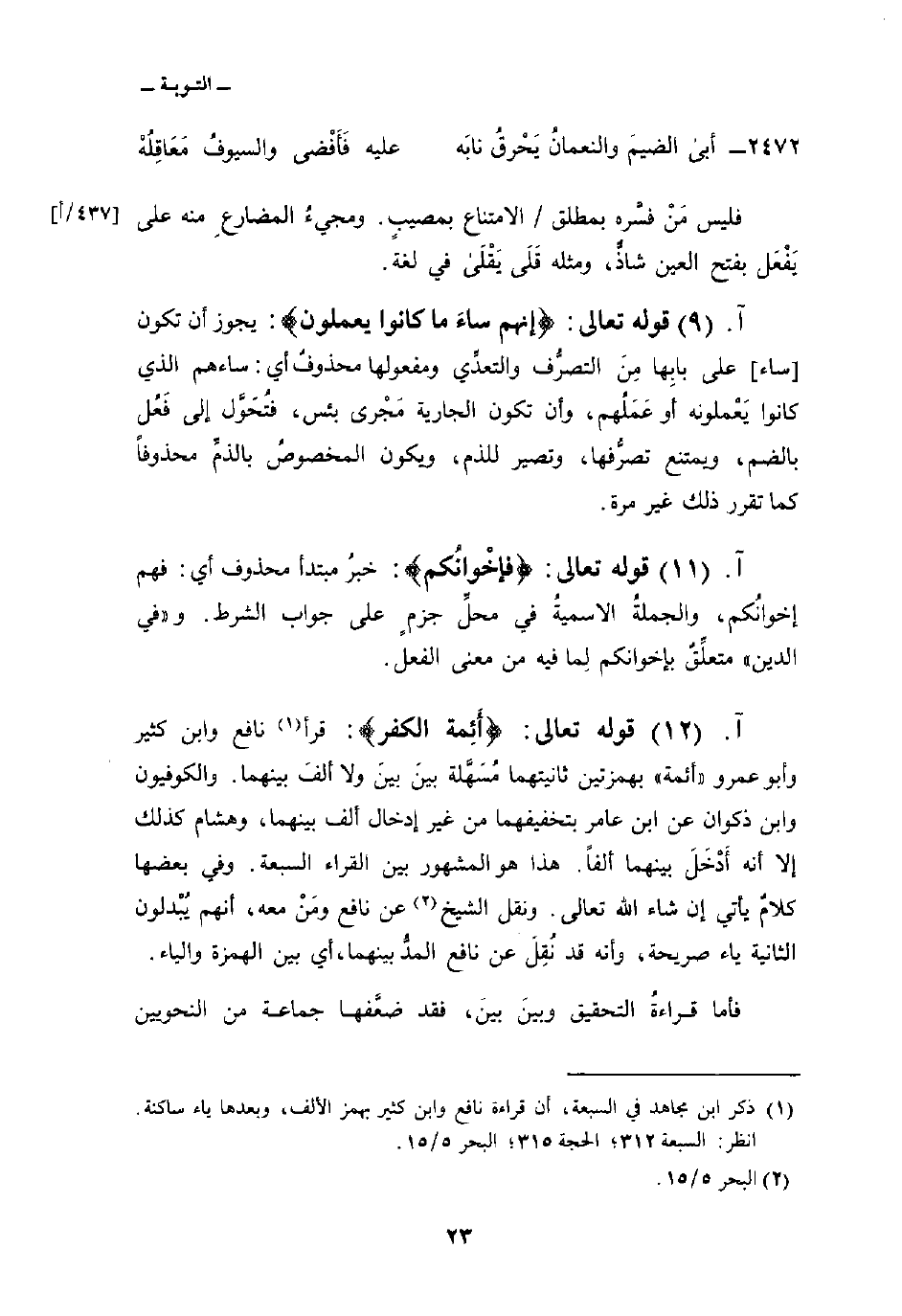قوله تعالى: {أَئِمَّةَ الكفر} : قرأ نافع وابن كثير وأبو عمرو «أئمة» بهمزتين ثانيتهما مُسَهَّلة بينَ بينَ ولا ألفَ بينهما. والكوفيون وابن ذكوان عن ابن عامر بتخفيفهما من غير إدخال ألف بينهما، وهشام كذلك إلا أنه أَدْخَلَ بينهما ألفاً. هذا هو المشهور بين القراء السبعة. وفي بعضها كلامٌ يأتي إن شاء الله تعالى. ونقل الشيخ عن نافع ومَنْ معه، أنهم يُبْدلون الثانية ياء صريحة، وأنه قد نُقِلَ عن نافع المدُّ بينهما، أي بين الهمزة والياء.