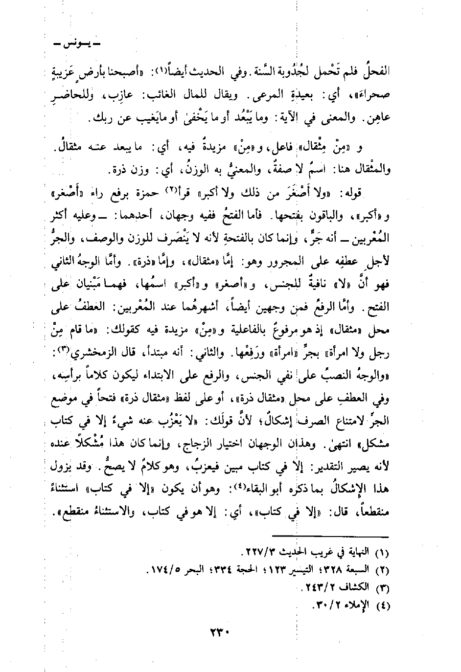 قوله: {وَلاَ أَصْغَرَ مِن ذلك ولا أَكْبَرَ} قرأ حمزة برفع راء «أَصْغر» و «أكبر» ، والباقون بفتحها. فأما الفتحُ ففيه وجهان، أحدهما: وعليه أكثر المُعْربين أنه جَرٌّ، وإنما كان بالفتحةِ لأنه لا يَنْصَرف للوزن والوصف، والجرُّ لأجلِ عطفِه على المجرور وهو: إمَّا «مثقال» ، وإمَّا «ذرة» . وأمَّا الوجهُ الثاني فهو أنَّ «لا» نافيةٌ للجنس، و «أصغر» و «أكبر» اسمُها، فهما مَبْنيان على الفتح. وأمَّا الرفعُ فمن وجهين أيضاً، أشهرهُما عند المُعْربين: العطفُ على محل «مثقال» إذ هو مرفوعٌ بالفاعلية و «مِنْ» مزيدة فيه كقولك: «ما قام مِنْ رجل ولا امرأة» بجرِّ «امرأة» ورَفِعْها. والثاني: أنه مبتدأ، قال الزمخشري: «والوجهُ النصبُ على نفي الجنس، والرفع على الابتداء ليكون كلاماً برأسِه، وفي العطفِ على محل» مثقال ذرة «، أو على لفظ» مثقال ذرة «فتحاً في موضع الجرِّ لامتناع الصرف إشكالٌ؛ لأنَّ قولَك:» لا يَعْزُب عنه شيءٌ إلا في كتاب مشكل «انتهى. وهذان الوجهان اختيار الزجاج، وإنما كان هذا مُشْكلاً عنده لأنه يصير التقدير: إلا في كتاب مبين فيعزبُ، وهو كلامٌ لا يصحُّ. وقد يزول هذا الإِشكالُ بما ذكره أبو البقاء: وهو أن يكون {إِلاَّ فِي كِتَابٍ مُّبِينٍ} استثناءٌ منقطعاً، قال: {إِلاَّ فِي كِتَابٍ} ، أي: إلا هو في كتاب، والاستثناءُ منقطع» .