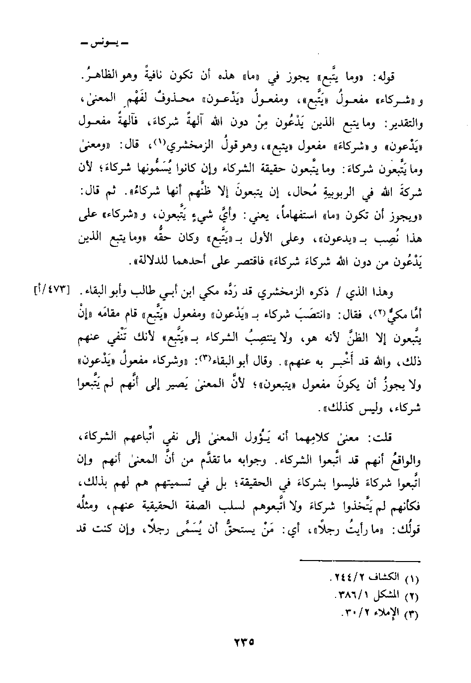 وهذا الذي/ ذكره الزمخشري قد رَدَّه مكي ابن أبي طالب وأبو البقاء. أمَّا مكيٌّن فقال: «انتصَبَ شركاء ب» يَدْعون «ومفعول» يَتَّبع «قام مقامَه» إنْ يتبعون إلا الظنَّ لأنه هو، ولا ينتصِبُ الشركاء ب «يَتَّبع» لأنك تَنْفي عنهم ذلك، والله قد أَخْبر به عنهم «. وقال أبو البقاء:» وشركاء مفعولٌ «يَدْعون» ولا يجوزُ أن يكونَ مفعول «يتبعون» ؛ لأنَّ المعنى يَصير إلى أنَّهم لم يَتَّبعوا شركاء، وليس كذلك.