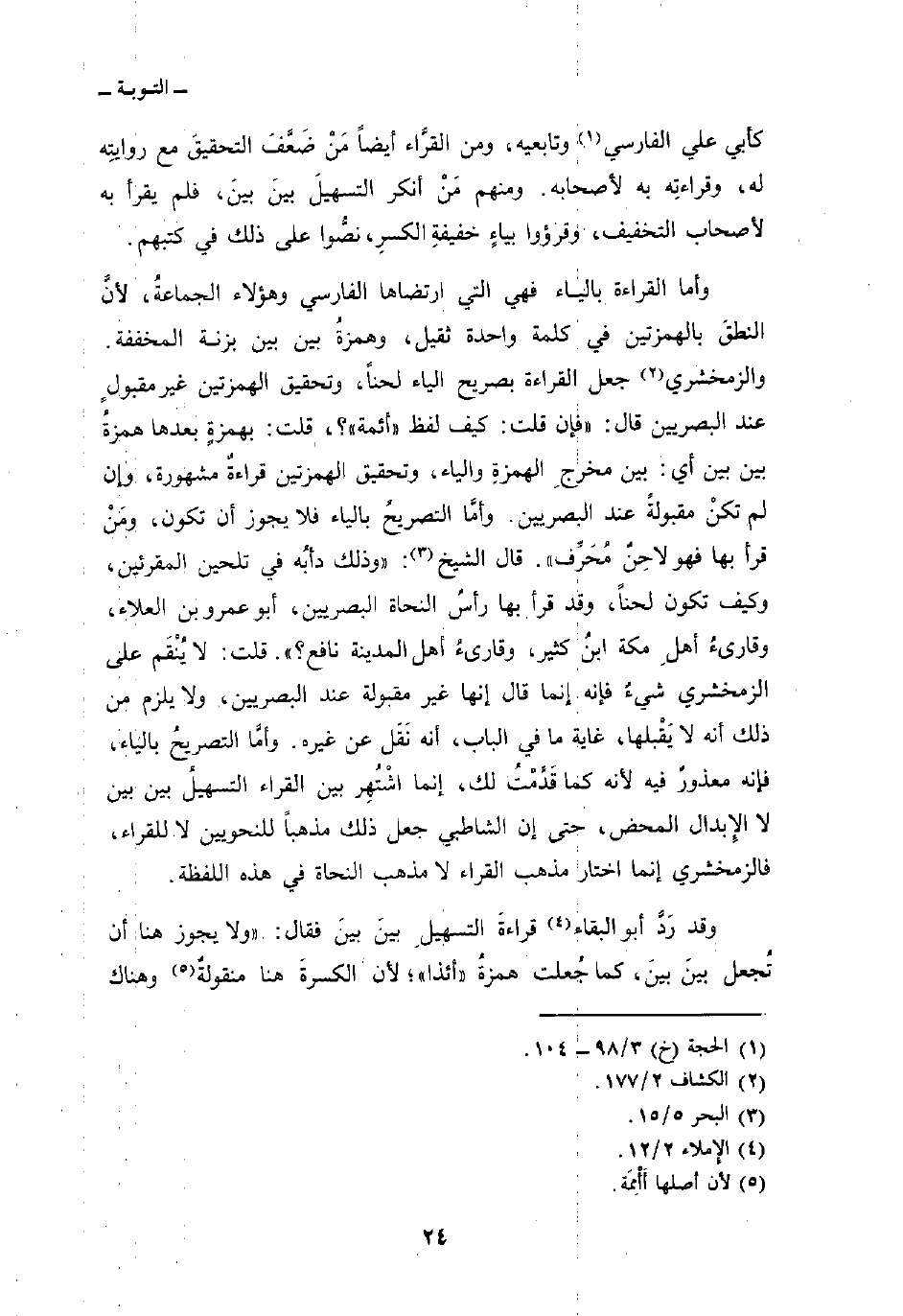 وأما القراءة بالياء فهي التي ارتضاها الفارسي وهؤلاء الجماعةُ، لأنَّ النطقَ بالهمزتين في كلمة واحدة ثقيل، وهمزةُ بين بين بزنة المخففة. والزمخشري جعل القراءة بصريح الياء لحناً، وتحقيق الهمزتين غير مقبولٍ عند البصريين قال: «فإن قلت: كيف لفظ» أئمة «؟ ، قلت: بهمزةٍ بعدها همزةُ بين بين أي: بين مخرجِ الهمزةِ والياء، وتحقيق الهمزتين قراءةٌ مشهورة، وإن لم تكنْ مقبولةً عند البصريين. وأمَّا التصريحُ بالياء فلا يجوز أن تكون، ومَنْ قرأ بها فهو لاحِنٌ مُحَرِّف» . قال الشيخ: «وذلك دأبُه في تلحين المقرئين، وكيف تكون لحناً، وقد قرأ بها رأسُ النحاة البصريين، أبو عمرو بن العلاء، وقارىءُ أهلِ مكة ابنُ كثير، وقارىءُ أهل المدينة نافع؟» . قلت: لا يُنْقَم على الزمخشري شيءٌ فإنه إنما قال إنها غير مقبولة عند البصريين، ولا يلزم من ذلك أنه لا يَقْبلها، غاية ما في الباب، أنه نَقَل عن غيره. وأمَّا التصريحُ بالياء، فإنه معذورٌ فيه لأنه كما قَدَّمْتُ لك، إنما اشْتُهِر بين القراء التسهيلُ بين بين لا الإِبدال المحض، حتى إن الشاطبي جعل ذلك مذهباً للنحويين لا للقراء، فالزمخشري إنما اختار مذهب القراء لا مذهب النحاة في هذه اللفظة.