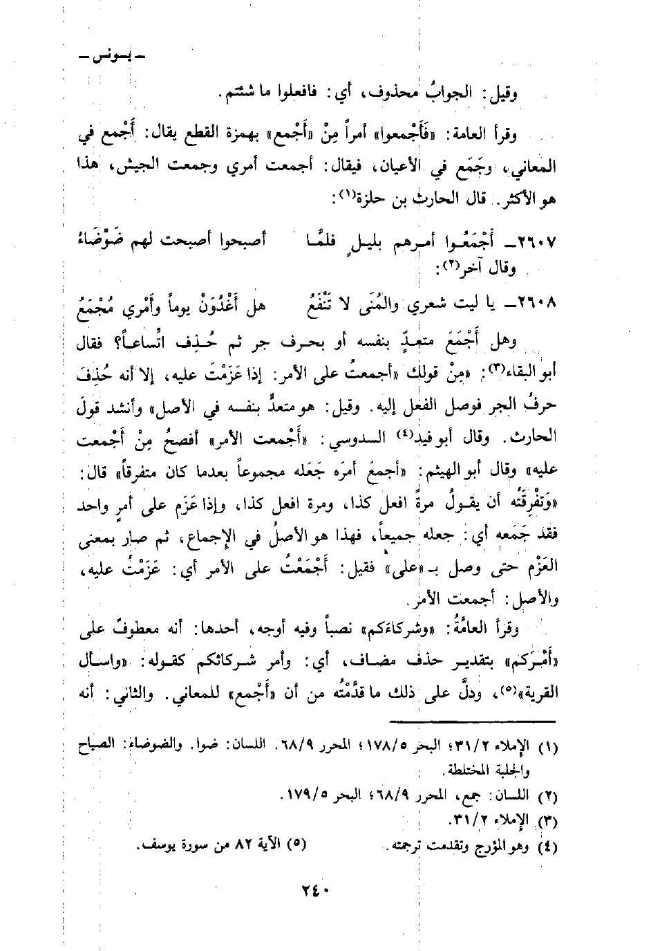 وقرأ العامة: «فَأَجْمعوا» أمراً مِنْ «أَجْمع» بهمزة القطع يقال: أَجْمع في المعاني، وجَمَع في الأعيان، فيقال: أجمعت أمري وجمعت الجيش، هذا هو الأكثر. قال الحارث بن حلزة: