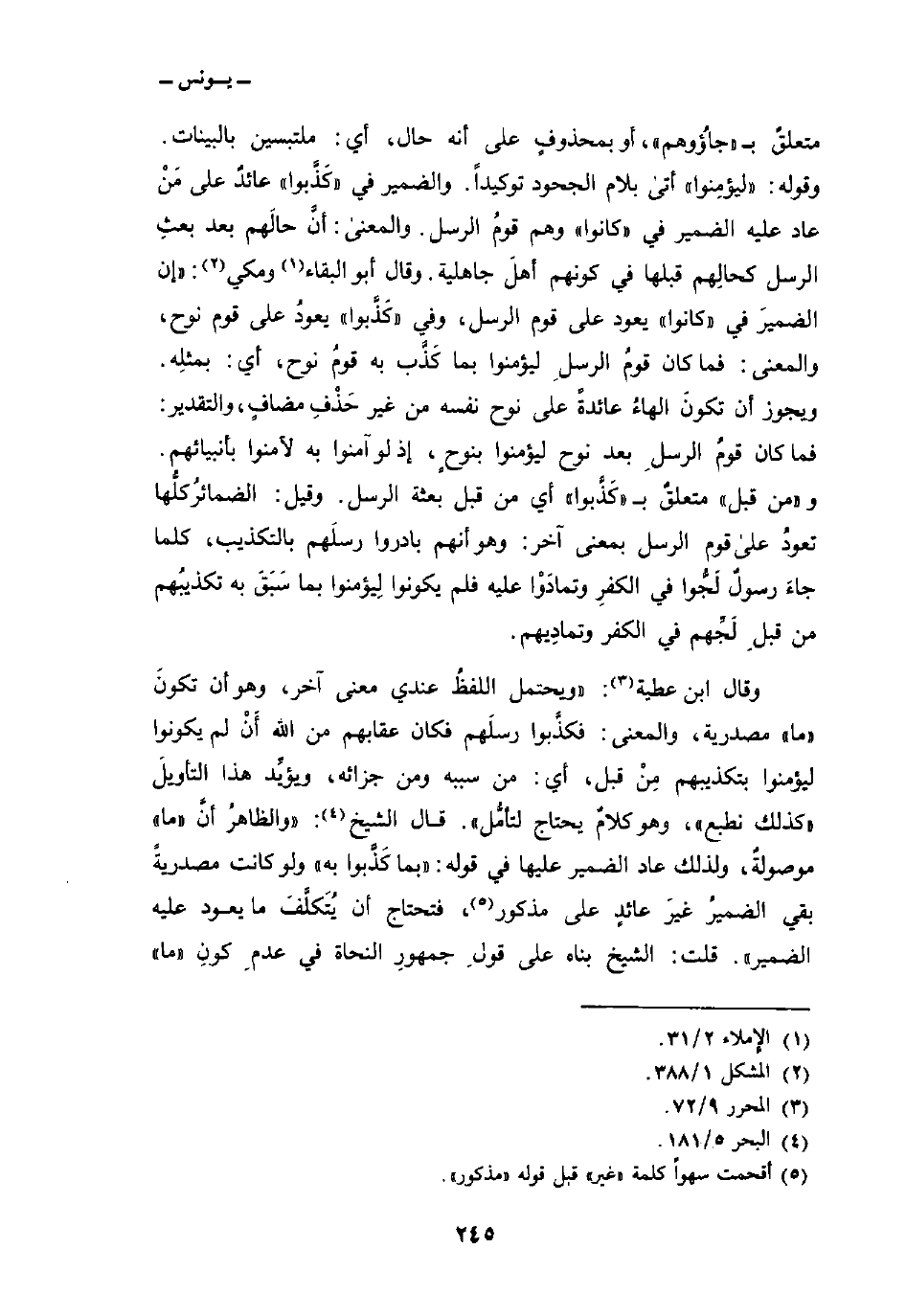وقال ابن عطية:» ويحتمل اللفظُ عندي معنى آخر، وهو أن تكونَ «ما» مصدرية، والمعنى: فكذَّبوا رسلَهم فكان عقابهم من الله أَنْ لم يكونوا ليؤمنوا بتكذيبهم مِنْ قبل، أي: من سببه ومن جزائه، ويؤيِّد هذا التأويلَ «كذلك نطبع» ، وهو كلامٌ يحتاج لتأمُّل «. قال الشيخ:» والظاهرُ أنَّ «ما» موصولةٌ، ولذلك عاد الضمير عليها في قوله: {بِمَا كَذَّبُواْ بِهِ} ولو كانت مصدريةً بقي الضميرُ غيرَ عائدٍ على مذكور، فتحتاج أن يتُكلَّفَ ما يعود عليه الضمير «. قلت: الشيخ بناه على قولِ جمهورِ النحاة في عدمِ كونِ» ما «