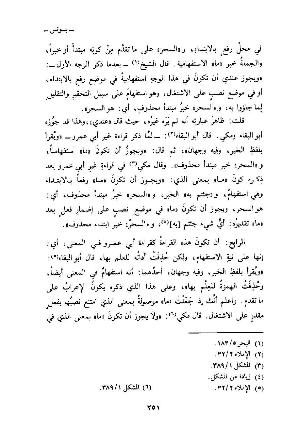 قلت: ظاهرُ عبارتِه أنه لم يَرَه غيرُه، حيث قال «عندي» ، وهذا قد جوَّزه أبو البقاء ومكي. قال أبو البقاء: لمَّا ذكر قراءة غير أبي عمرو «ويُقرأ بلفظِ الخبر، وفيه وجهان» ، ثم قال: «ويجوزُ أن تكونَ» ما «استفهاماً، و» السحر «خبر مبتدأ محذوف» . وقال مكي في قراءةِ غيرِ أبي عمرو بعد ذِكره كونَ «ما» بمعنى الذي: «ويجوز أن تكونَ» ما «رفعاً بالابتداء وهي استفهامُ، و» جئتم به «الخبر، و» السحر «خبرُ مبتدأ محذوف، أي: هو السحر، ويجوز أن تكونَ» ما «في موضعِ نصبٍ على إضمارِ فعلٍ بعد» ما «تقديرُه: أيُّ شيء جئتم [به] ، و» السحرُ «خبر ابتداء محذوف» .