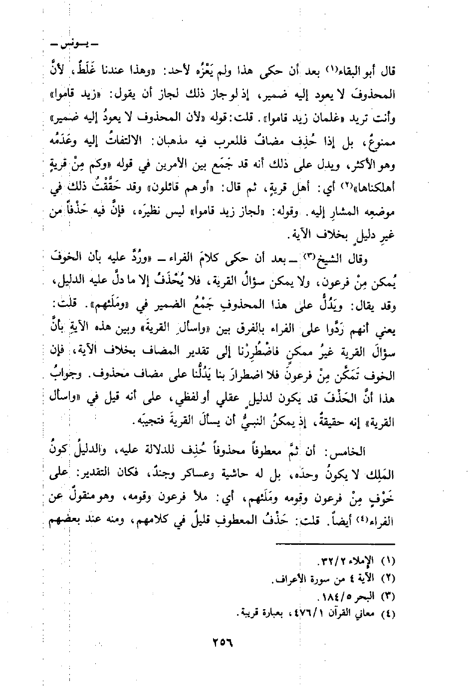 وقال الشيخ بعد أن حكى كلامَ الفراء» ورُدَّ عليه بأن الخوفَ يُمكن مِنْ فرعون، ولا يمكن سؤالُ القرية، فلا يُحْذَفُ إلا ما دلَّ عليه الدليل، وقد يقال: ويَدُلُّ على هذا المحذوفِ جَمْعُ الضمير في «ومَلَئهم» . قلت: يعني أنهم رَدُّوا على الفراء بالفرق بين {وَسْئَلِ القرية} وبين هذه الآيةِ بأنَّ سؤالَ القرية غيرُ ممكنٍ فاضْطُرِرْنا إلى تقدير المضاف بخلاف الآية، فإن الخوف تَمَكَّن مِنْ فرعونَ فلا اضطرارَ بنا يَدُلُّنا على مضاف محذوف. وجوابُ هذا أنَّ الحَذْفَ قد يكون لدليلٍ عقلي أو لفظي، على أنه قيل في «واسأل القرية» إنه حقيقةٌ، إذ يمكنُ النبيُّ أن يسألَ القريةَ فتجيبَه.