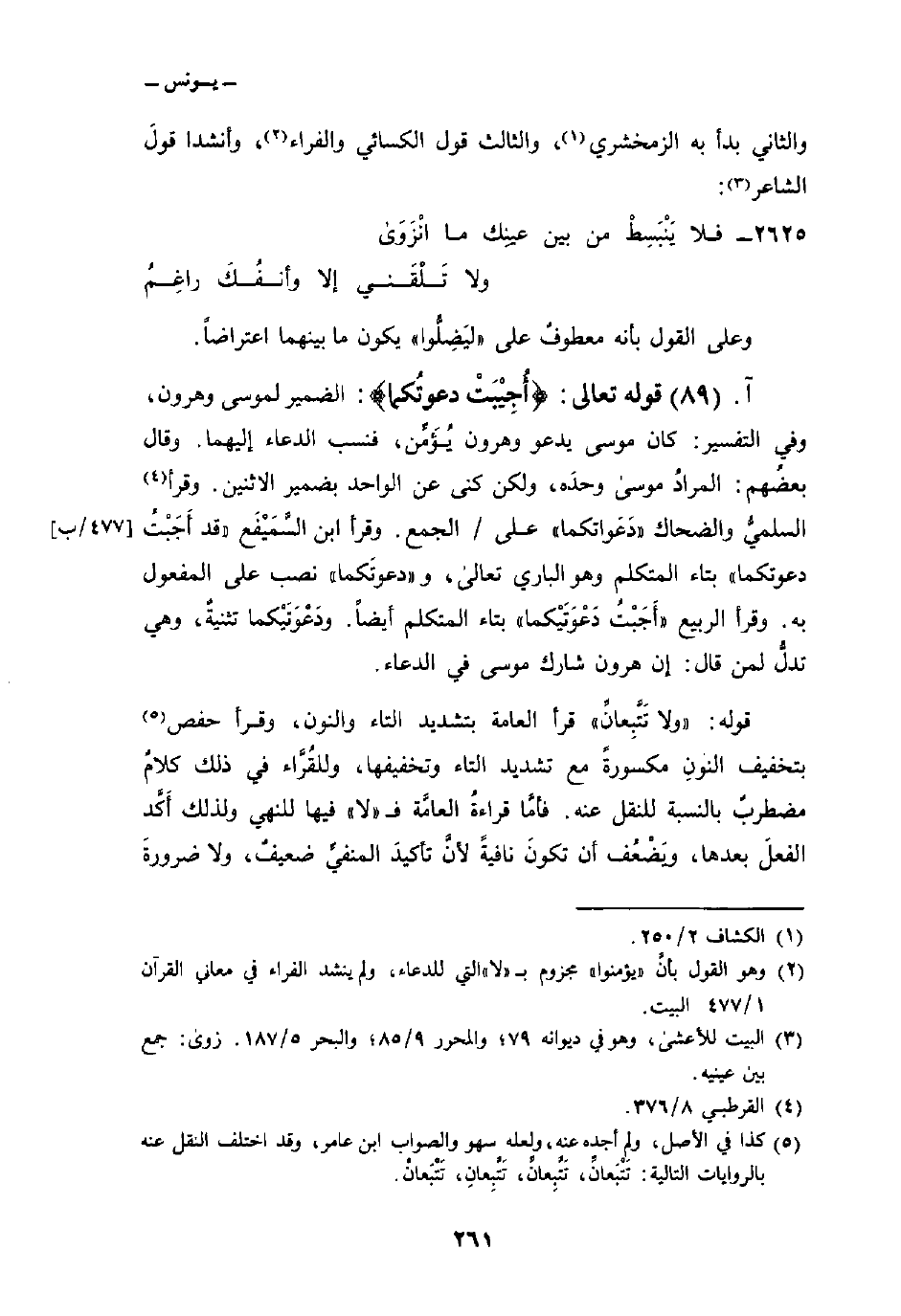 قوله تعالى: {أُجِيبَتْ دَّعْوَتُكُمَا} : الضمير لموسى وهرون، وفي التفسير: كان موسى يدعو وهرون يُؤَمِّن، فنسب الدعاء إليهما. وقال بعضُهم: المرادُ موسى وحدَه، ولكن كنى عن الواحد بضمير الاثنين. وقرأ السلميُّ والضحاك «دَعَواتكما» على/ الجمع. وقرأ ابن السَّمَيْفَع «قد أَجَبْتُ دعوتكما» بتاء المتكلم وهو الباري تعالى، و «دعوتَكما» نصب على المفعول به. وقرأ الربيع «أَجَبْتُ دَعْوَتَيْكما» بتاء المتكلم أيضاً. ودَعْوَتَيْكما تثنيةٌ، وهي تدلُّ لمن قال: إن هرون شارك موسى في الدعاء.