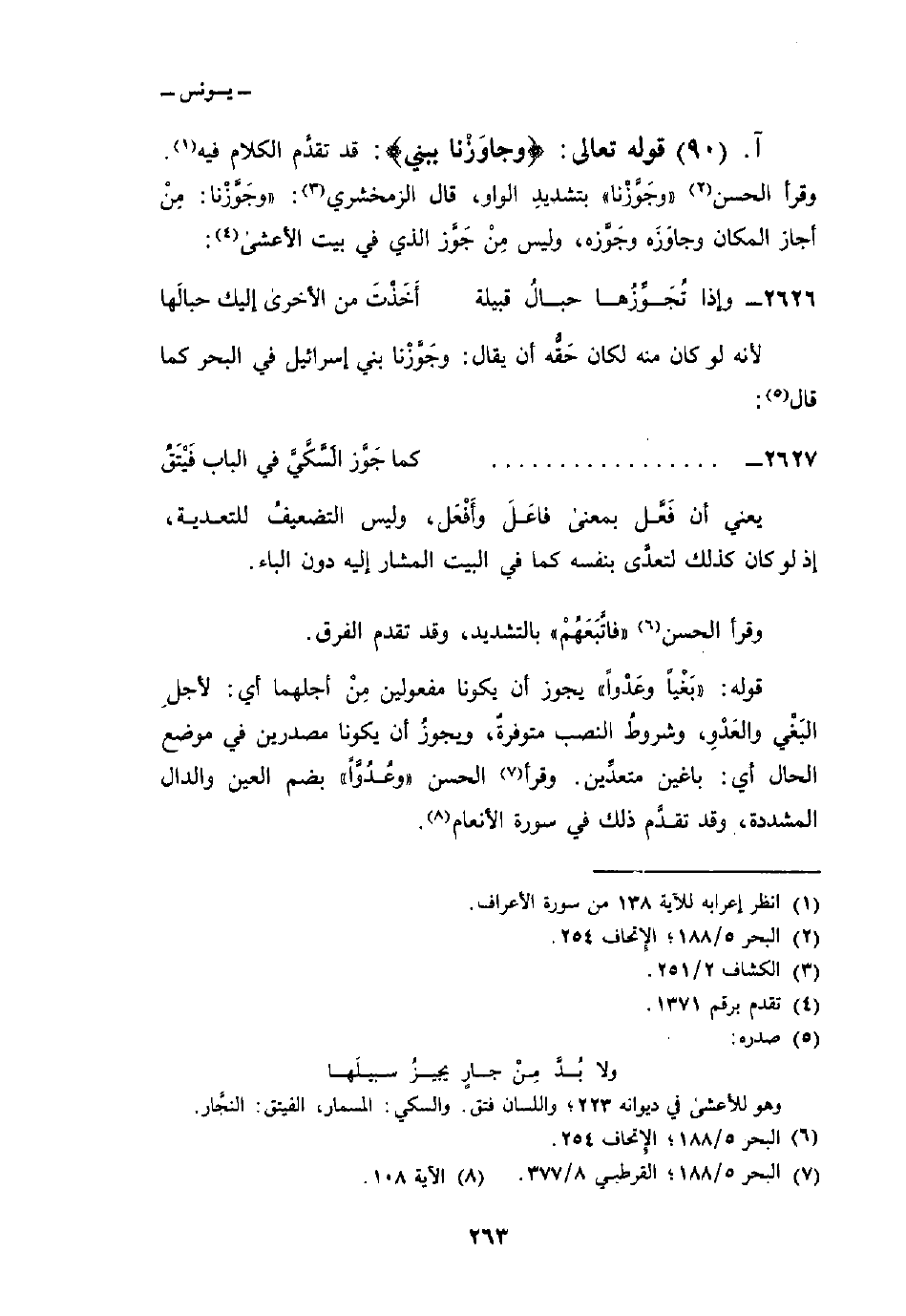 قوله تعالى: {وَجَاوَزْنَا ببني} : قد تقدَّم الكلام فيه. وقرأ الحسن «وجَوَّزْنا» بتشديدِ الواو، قال الزمخشري: «وجَوَّزْنا: مِنْ أجاز المكان وجاوَزَه وجَوَّزه، وليس مِنْ جَوَّز الذي في بيت الأعشى: