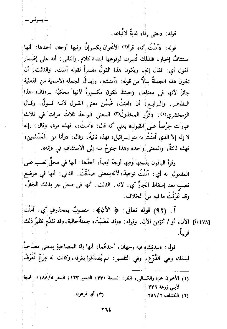 قوله: {آمَنتُ أَنَّهُ} قرأ الأخَوان بكسر إنَّ وفيها أوجه، أحدها: أنها استئنافُ إخبار، فلذلك كُسِرت لوقوعِها ابتداءَ كلام. والثاني: أنه على إضمار القول أي: فقال إنه، ويكون هذا القولُ مفسراً لقوله آمنت. والثالث: أن تكون هذه الجملةُ بدلاً من قوله:» آمنت «، وإبدالُ الجملةِ الاسمية من الفعلية جائزٌ لأنها في معناها، وحينئذ تكون مكسورةً لأنها محكيَّة ب» قال «هذا الظاهر. والرابع: أن» آمنتُ «ضُمِّن معنى القول لأنه قولٌ. وقال الزمخشري:» كَرَّر المخذولُ المعنى الواحدَ ثلاثَ مرات في ثلاث عبارات حِرْصاً على القبول «يعني أنه قال:» آمنتُ «، فهذه مرة، وقال: {أَنَّهُ لا إله إِلاَّ الذي آمَنَتْ بِهِ بنوا إِسْرَائِيلَ} فهذه ثانيةٌ، وقال: {وَأَنَاْ مِنَ المسلمين} فهذه ثالثةٌ، والمعنى واحد» وهذا جنوحٌ منه إلى الاستئنافِ في «إنه» .