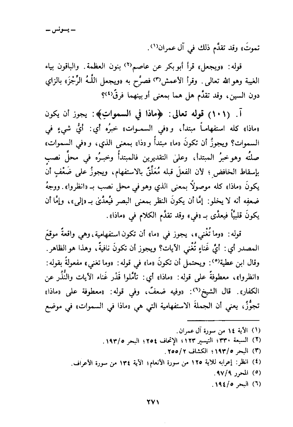 قوله: {وَمَا تُغْنِي} ، يجوز في «ما» أن تكون استفهامية، وهي واقعةٌ موقعَ المصدر أي: أيَّ غَناءٍ تُغْني الآيات؟ ويجوز أن تكونَ نافيةً، وهذا هو الظاهر. وقال ابن عطية: ويحتمل أن تكونَ «ما» في قوله: «وما تغني» مفعولةً بقوله: «انظروا» ، معطوفةً على قوله: «ماذا» أي: تأمَّلوا قَدْر غَناء الآيات والنُّذُر عن الكفار «. قال الشيخ:» وفيه ضعفٌ، وفي قوله: «معطوفة على» ماذا «تجُّوزٌ، يعني أن الجملةَ الاستفهامية التي هي {مَاذَا فِي السماوات} في موضع