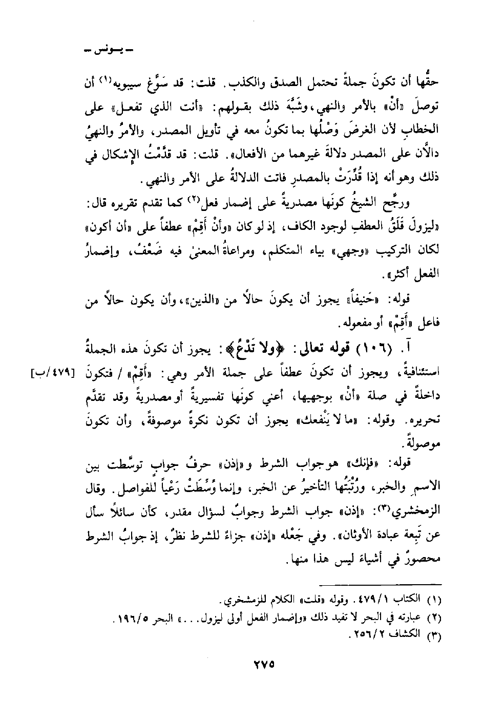 ورجَّح الشيخُ كونَها مصدريةً على إضمار فعل كما تقدم تقريره قال: «ليزولَ قَلَقُ العطفِ لوجود الكاف، إذ لو كان» وأنْ أَقِمْ «عطفاً على» أن أكون «لكان التركيب» وجهي «بياء المتكلم، ومراعاةُ المعنى فيه ضَعْفٌ، وإضمارُ الفعل أكثر» .