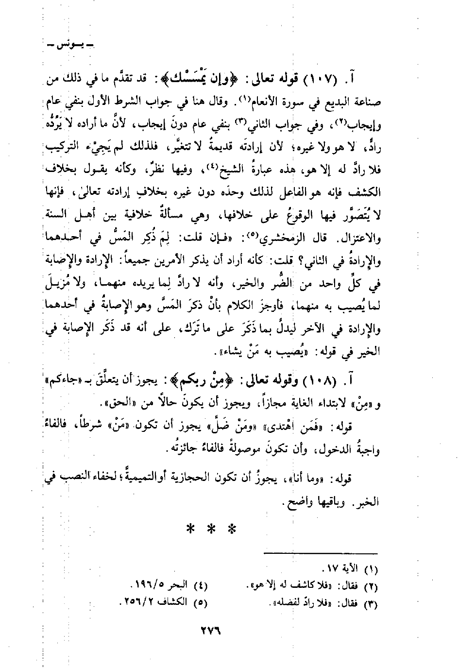 قوله تعالى: {وَإِن يَمْسَسْكَ} : قد تقدَّم ما في ذلك من صناعة البديع في سورة الأنعام. وقال هنا في جواب الشرط الأول بنفي عام وإيجاب، وفي جواب الثاني بنفي عام دونَ إيجاب، لأنَّ ما أراده لا يَرُدُّه رادٌّ، لا هو ولا غيره؛ لأن إرادتَه قديمةٌ لا تتغيَّر، فلذلك لم يَجِيْء التركيب فلا رادَّ له إلا هو، هذه عبارةُ الشيخ، وفيها نظرٌ، وكأنه يقول بخلاف الكشف فإنه هو الفاعل لذلك وحدَه دون غيره بخلافِ إرادته تعالى، فإنها لا يُتَصَوَّر فيها الوقوعُ على خلافها، وهي مسألةٌ خلافية بين أهل السنة والاعتزال. قال الزمخشري: «فإن قلت: لِمَ ذُكِر المَسُّ في أحدهما والإِرادةُ في الثاني؟ قلت: كأنه أراد أن يذكر الأمرين جميعاً: الإِرادة والإِصابة في كلِّ واحد من الضُّر والخير، وأنه لا رادَّ لِما يريده منهما، ولا مُزيلَ لما يُصيب به منهما، فأوجزَ الكلام بأنْ ذكرَ المَسَّ وهو الإِصابةُ في أحدهما والإِرادة في الآخر ليدلَّ بما ذَكَرَ على ما تَرَك، على أنه قد ذَكَر الإِصابة في الخير في قوله: {يُصَيبُ بِهِ مَن يَشَآءُ} .