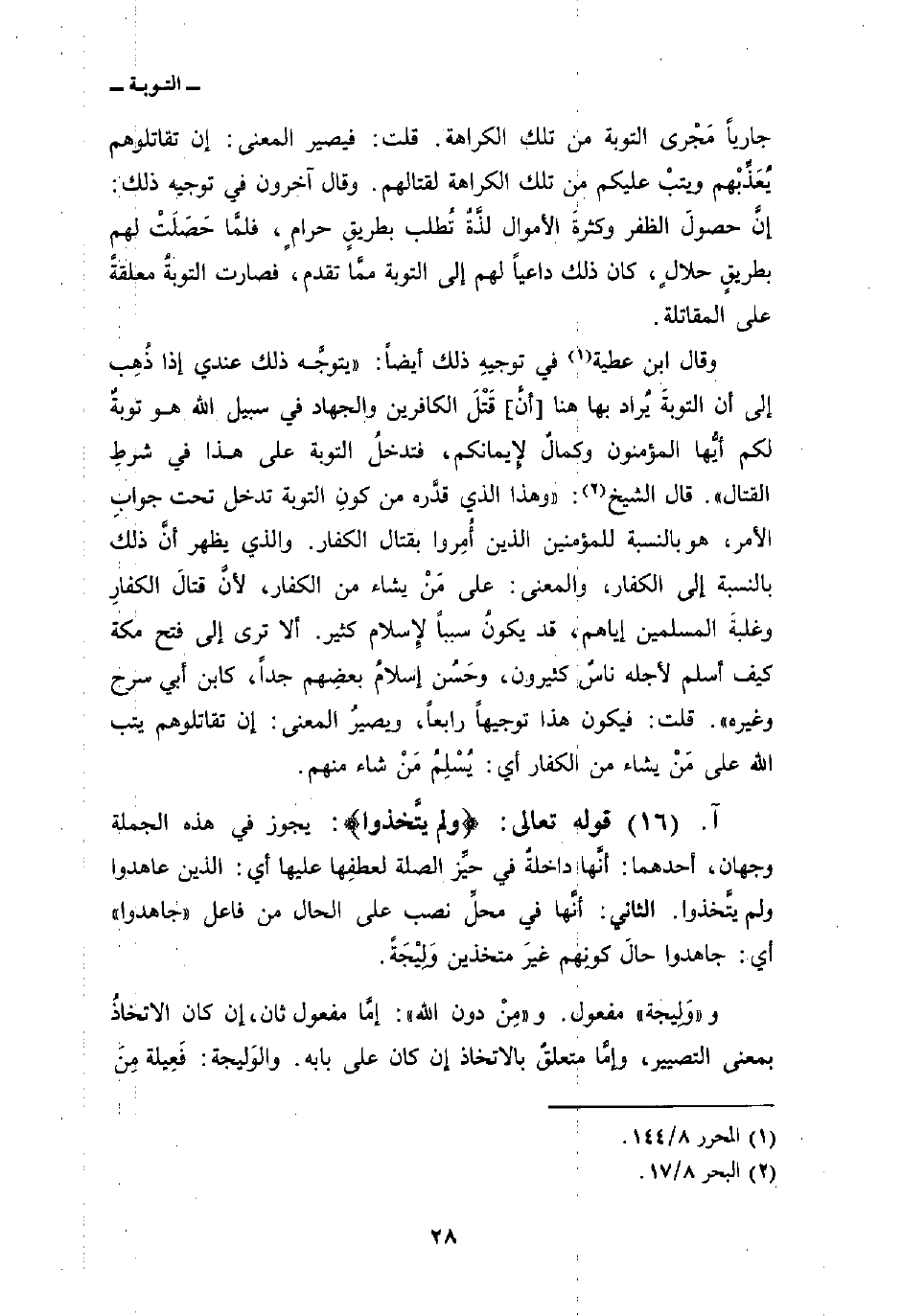 جارياً مَجْرى التوبة من تلك الكراهة. قلت: فيصير المعنى: إن تقاتلوهم يُعَذِّبْهم ويتبْ عليكم من تلك الكراهة لقتالهم. وقال آخرون في توجيه ذلك: إنَّ حصولَ الظفر وكثرةَ الأموال لذَّةٌ تُطلب بطريقٍ حرامٍ، فلمَّا حَصَلَتْ لهم بطريقٍ حلالٍ، كان ذلك داعياً لهم إلى التوبة ممَّا تقدم، فصارت التوبةُ معلقةً على المقاتلة.