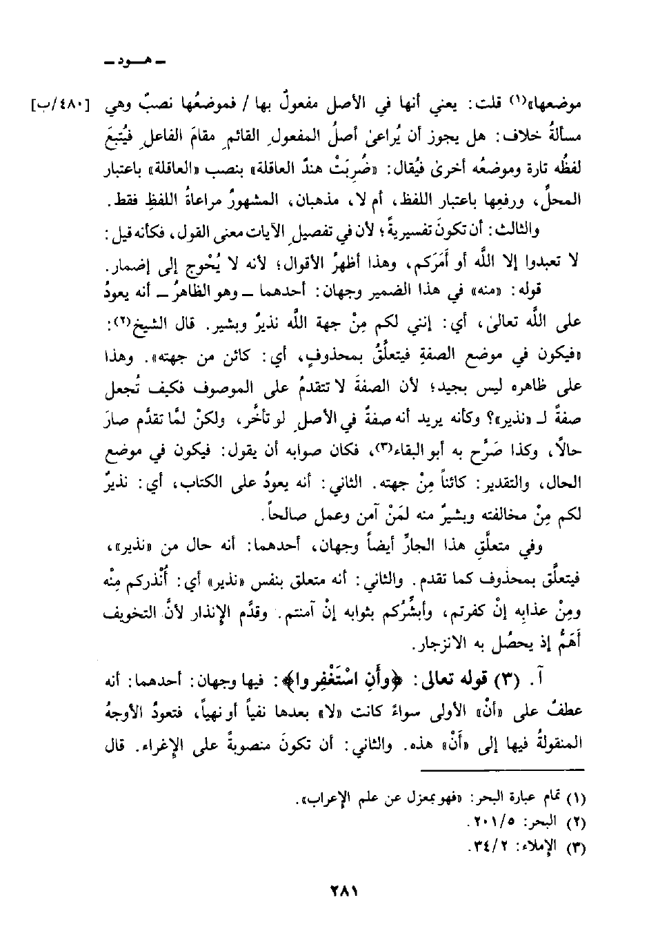 قوله: «منه» في هذا الضمير وجهان: أحدهما وهو الظاهرُ أنه يعودُ على اللَّه تعالى، أي: إنني لكم مِنْ جهة اللَّه نذيرٌ وبشير. قال الشيخ: «فيكون في موضع الصفةِ فيتعلَّقُ بمحذوفٍ، أي: كائن من جهته» . وهذا على ظاهره ليس بجيد؛ لأن الصفةَ لا تتقدمُ على الموصوف فكيف تُجعلِ صفةً ل «نذير» ؟ كأنه يريد أنه صفةٌ في الأصلِ لو تأخَّر، ولكنْ لمَّا تقدَّم صارَ حالاً، وكذا صَرَّح به أبو البقاء، فكان صوابه أن يقول: فيكون في موضع الحال، والتقدير: كائناً مِنْ جهته. الثاني: أنه يعودُ على الكتاب، أي: نذيرٌ لكم مِنْ مخالفته وبشيرٌ منه لمَنْ آمن وعمل صالحاً.