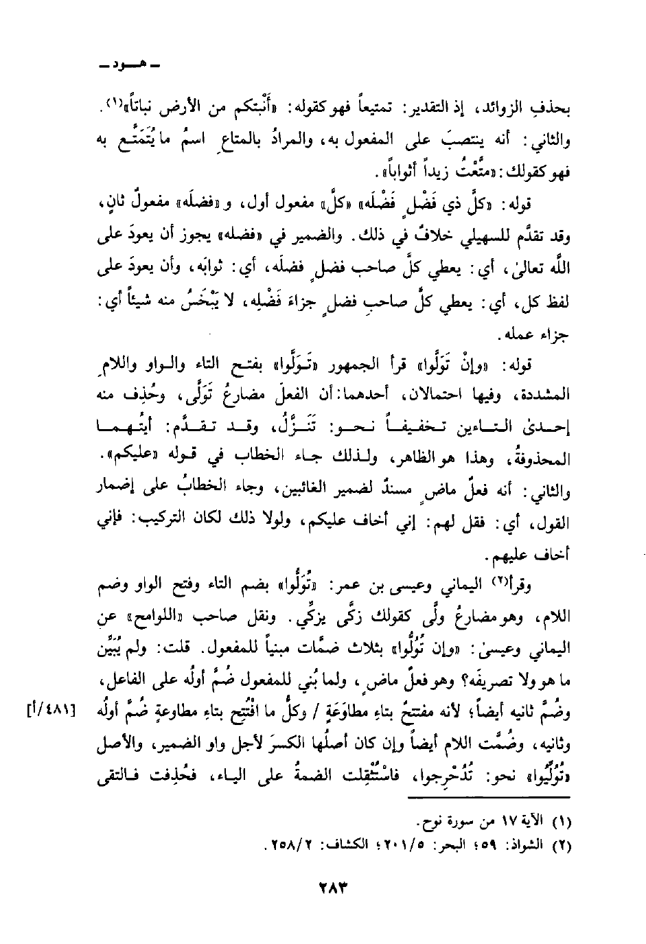 قوله: {وَإِن تَوَلَّوْاْ} قرأ الجمهور «تَوَلَّوا» بفتح التاء والواو واللامِ المشددة، وفيها احتمالان، أحدهما: أن الفعلَ مضارعُ تَوَلَّى، وحُذِف منه إحدى التاءين تخفيفاً نحو: تَنَزَّلُ، وقد تقدَّم: أيتُهما المحذوفةُ، وهذا هو الظاهر، ولذلك جاء الخطاب في قوله «عليكم» . والثاني: أنه فعلٌ ماضٍ مسندٌ لضمير الغائبين، وجاء الخطابُ على إضمار القول، أي: فقل لهم: إني أخاف عليكم، ولولا ذلك لكان التركيب: فإني أخاف عليهم.