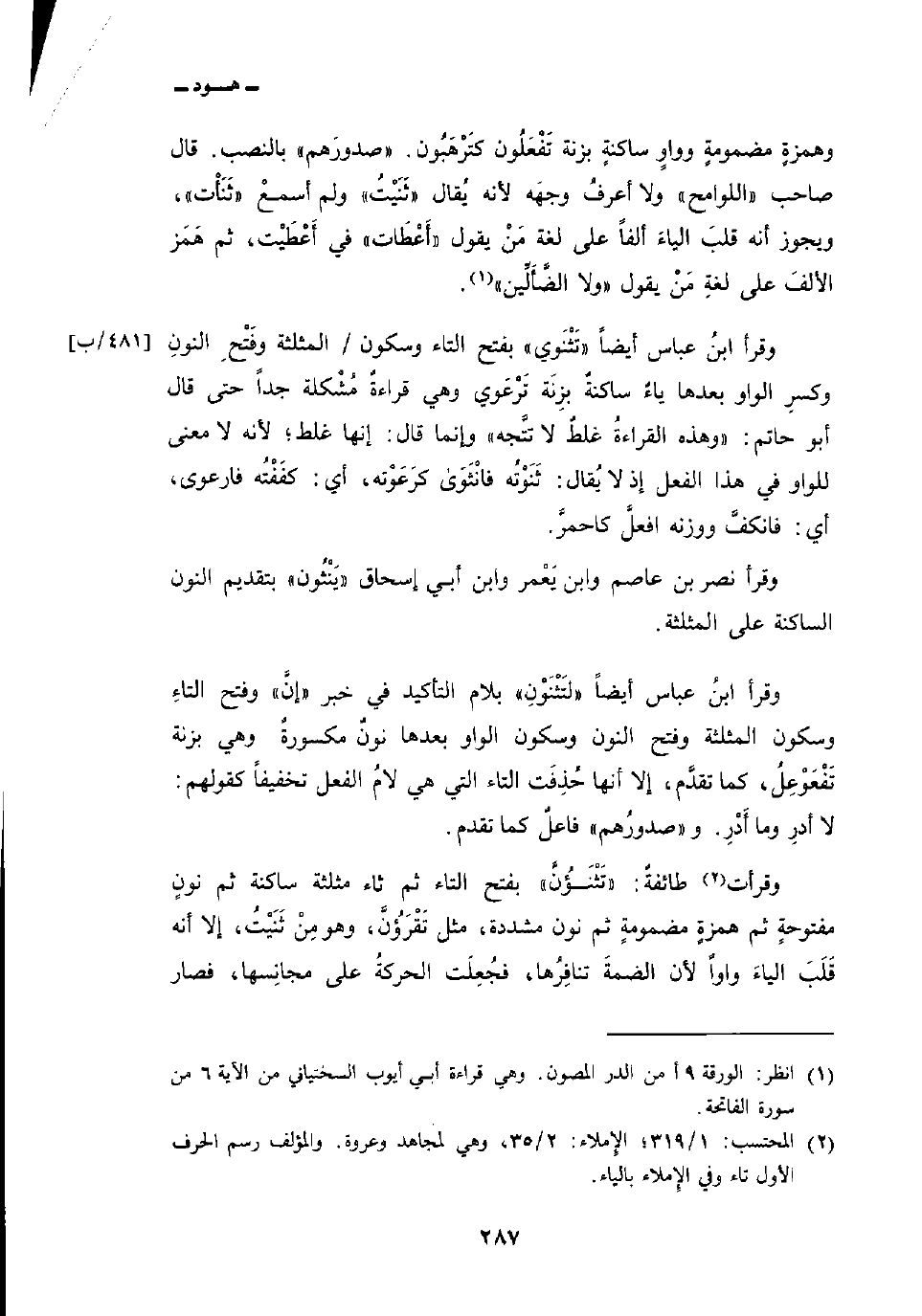 وقرأ طائفةٌ:» تَثْنَؤُنَّ «بفتح التاء ثم ثاء مثلثة ساكنة ثم نونٍ مفتوحةٍ ثم همزةٍ مضمومةٍ ثم نون مشددة، مثل تَقْرَؤُنَّ، وهو مِنْ ثَنَيْتُ، إلا أنه قَلَبَ الياءَ واواً لأن الضمةَ تنافِرُها، فجُعِلَت الحركةُ على مجانِسها، فصار