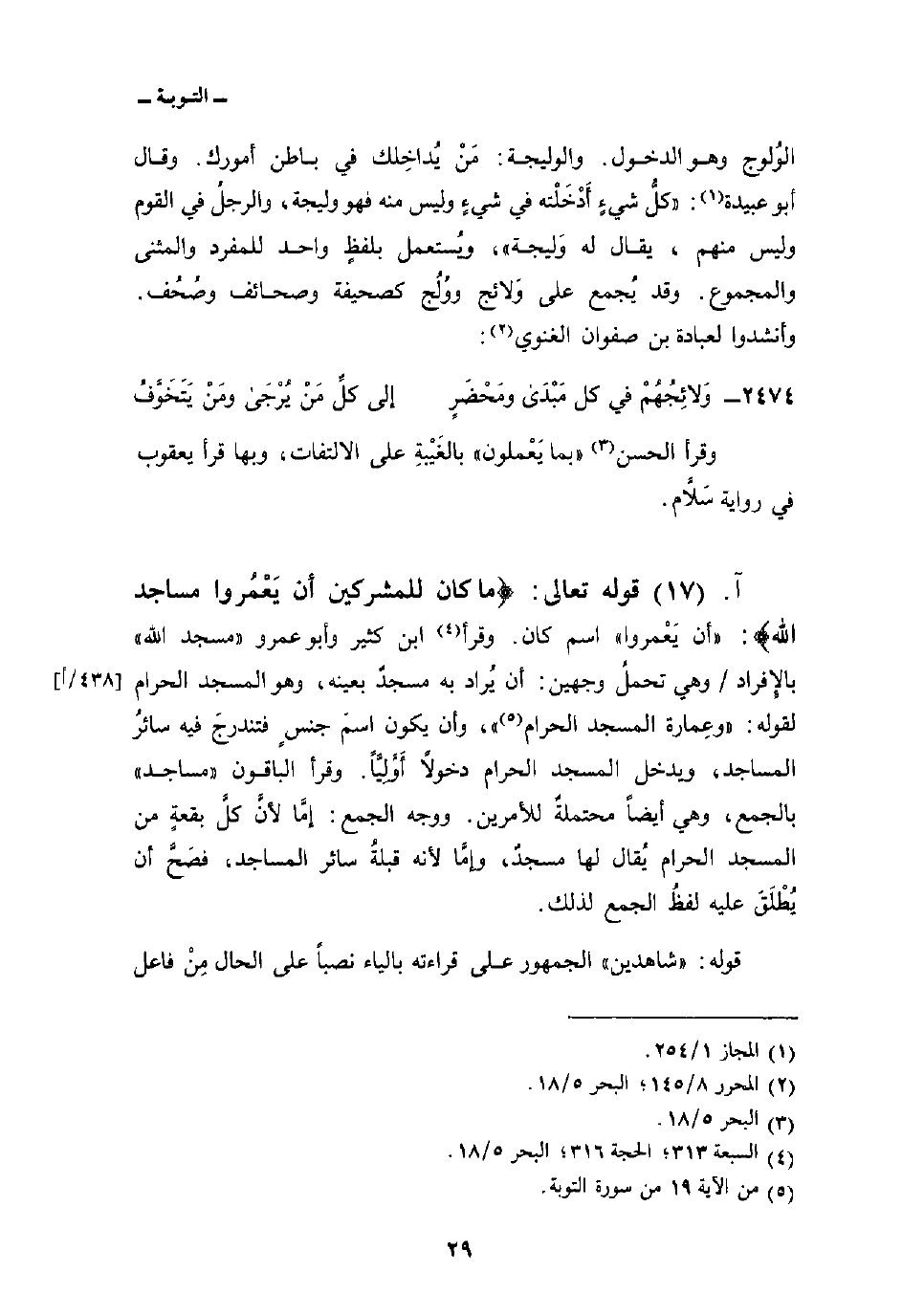 قوله تعالى: {مَا كَانَ لِلْمُشْرِكِينَ أَن يَعْمُرُواْ مَسَاجِدَ الله} : «أن يَعْمروا» اسم كان. وقرأ ابن كثير وأبو عمرو «مسجد الله» بالإِفراد/ وهي تحملُ وجهين: أن يُراد به مسجدٌ بعينه، وهو المسجد الحرام لقوله: {وَعِمَارَةَ المسجد الحرام} [التوبة: 19] ، وأن يكون اسمَ جنسٍ فتندرجَ فيه سائرُ المساجد، ويدخل المسجد الحرام دخولاً أَوَّلِيَّاً. وقرأ الباقون «مساجد» بالجمع، وهي أيضاً محتملةٌ للأمرين. ووجه الجمع: إمَّا لأنَّ كلَّ بقعةٍ من المسجد الحرام يُقال لها مسجدٌ، وإمَّا لأنه قبلةُ سائر المساجد، فصَحَّ أن يُطْلَقَ عليه لفظُ الجمع لذلك.