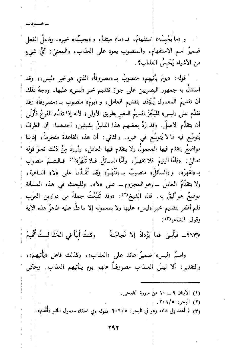 قوله: {يَوْمَ يَأْتِيهِمْ} منصوبٌ ب «مصروفاً» الذي هو خبر «ليس» ، وقد استدلَّ به جمهور البصريين على جواز تقديم خبر «ليس عليها، ووجهُ ذلك أن تقديمَ المعمول يُؤْذن بتقديم العامل، و» يومَ «منصوب ب» مصروفاً «وقد تقدَّم على» ليس «فليَجُزْ تقديمُ الخبرِ بطريق الأولى؛ لأنه إذا تقدَّم الفرعُ فأولى أن يتقدَّم الأصلُ. وقد رَدَّ بعضهم هذا الدليلَ بشيئين، أحدهما: أن الظرفَ يُتوسَّع فيه ما لا يُتوسَّع في غيره. والثاني: أن هذه القاعدةَ منخرمةٌ، إذ لنا مواضعُ يتقدم فيها المعمولُ ولا يتقدم فيها العامل، وأوردَ مِنْ ذلك نحوَ قوله تعالى: {فَأَمَّا اليتيم فَلاَ تَقْهَرْ وَأَمَّا السآئل فَلاَ تَنْهَرْ} [الضحى: 9-10] فاليتيمَ منصوب ب» تقهرْ «، و» السائلَ «منصوبٌ ب» تَنْهَرْ «وقد تَقَدَّما على» لا «الناهية، ولا يتقدَّمُ العاملُ وهو المجزوم على» لا «، وللبحث في هذه المسألة موضعٌ هو أليقُ به. قال الشيخ:» وقد تَتَبَّعْتُ جملةً من دواوين العرب فلم أظفر بتقديم خبر «ليس» عليها ولا بمعموله إلا ما دلَّ عليه ظاهرُ هذه الآية وقولِ الشاعر: