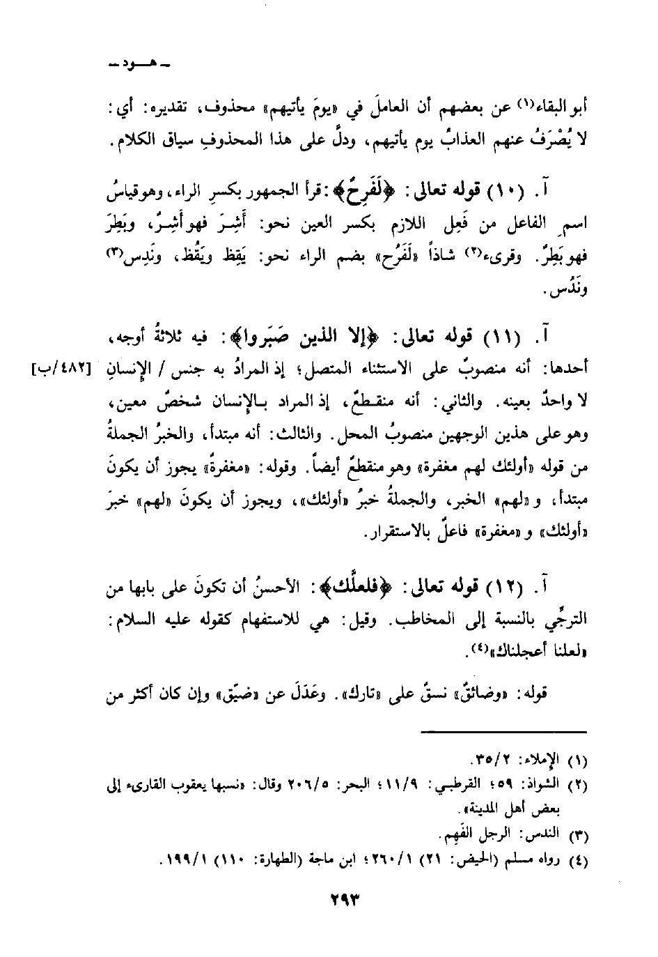 قوله تعالى: {إِلاَّ الذين صَبَرُواْ} : فيه ثلاثةُ أوجه، أحدها: أنه منصوبٌ على الاستثناء المتصل؛ إذ المرادُ به جنس/ الإِنسانِ لا واحدٌ بعينه. والثاني: أنه منقطعٌ، إذ المراد بالإِنسان شخصٌ معين، وهو على هذين الوجهين منصوبُ المحل. والثالث: أنه مبتدأ، والخبرُ الجملةُ من قوله {أولئك لَهُمْ مَّغْفِرَةٌ} وهو منقطعٌ أيضاً. وقوله: «مغفرةٌ» يجوز أن يكونَ مبتدأ، و «لهم» الخبر، والجملةُ خبرُ «أولئك» ، ويجوز أن يكونَ «لهم» خبرَ «أولئك» و «مغفرة» فاعلٌ بالاستقرار.